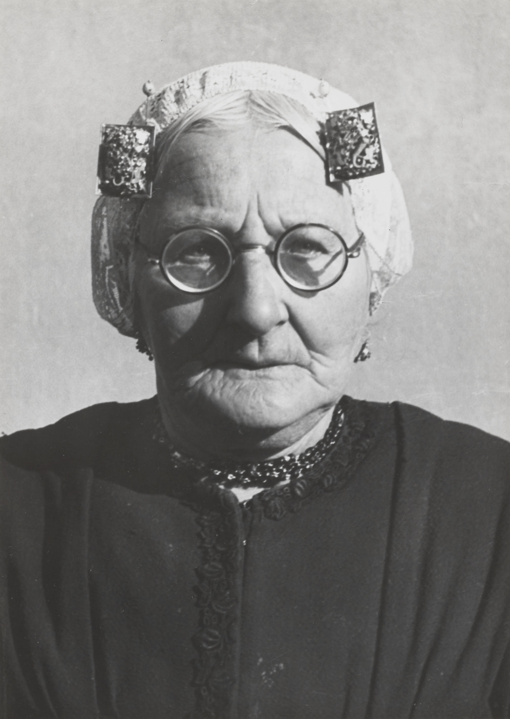 Vrouw in Sallandse streekdracht, 1943 (zwart-wit foto)