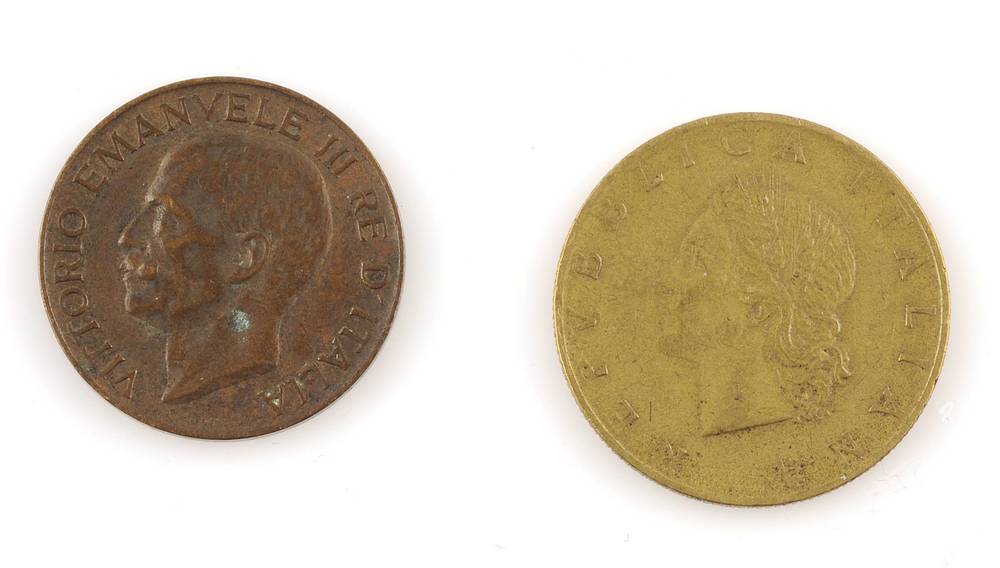 twee munten : 5 cnts 1929 en 20 lire 1958