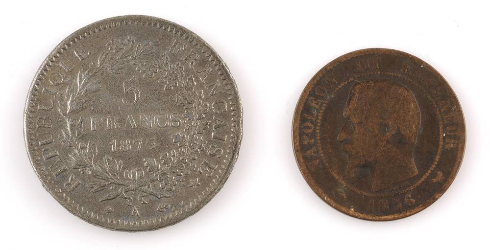 twee munten: 5 Francs 1875 en 10 centimes 1856