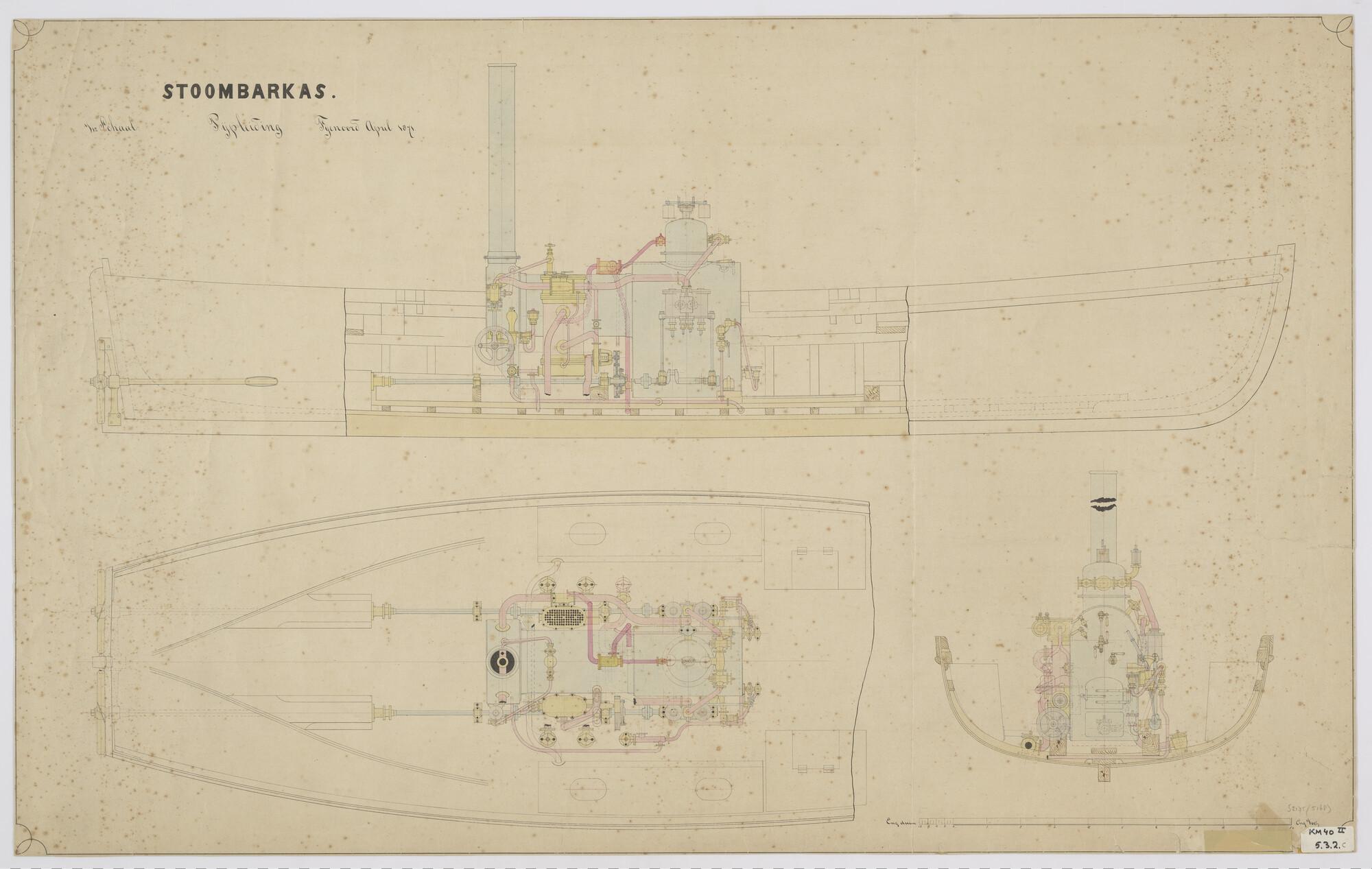 Doorsneden en bovenaanzicht van een stoombarkas met ...