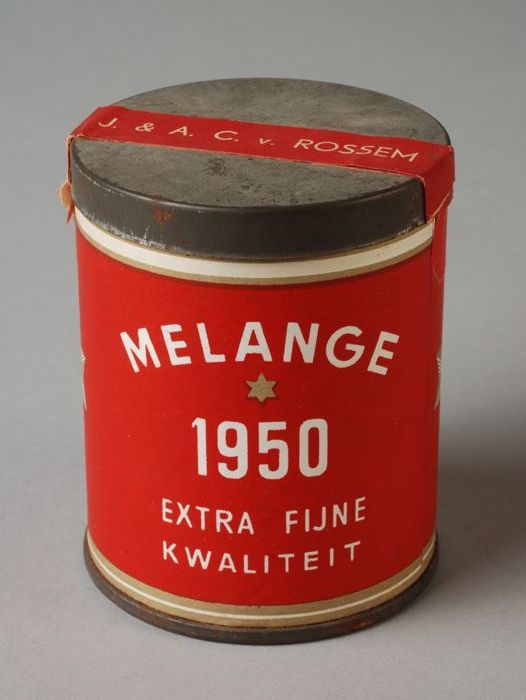 Oranje pakje tabak met rode letters van Van Rossem, ...