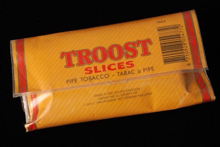 Beige pakje tabak van Van Rossem, productnaam Troost...