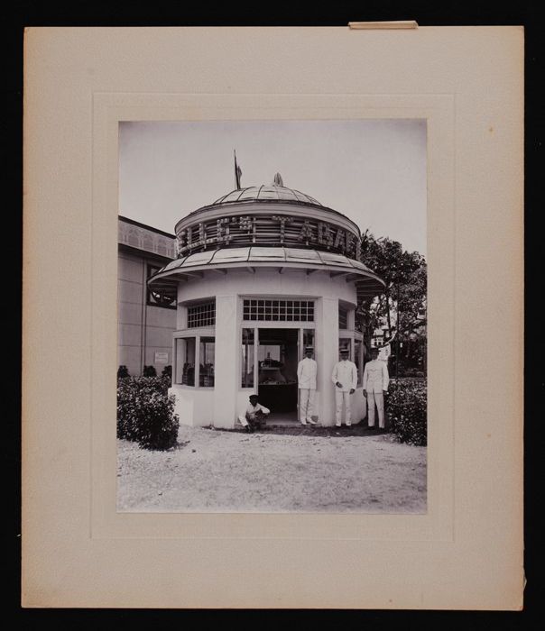 Foto van een paviljoen in Semarang met lichtreclame ...