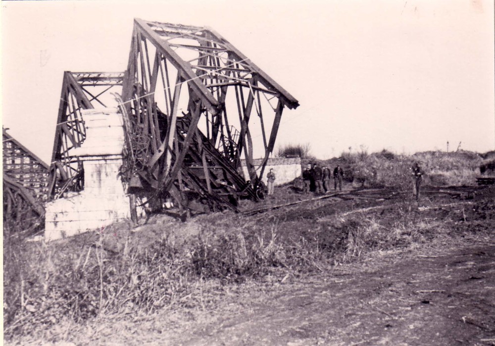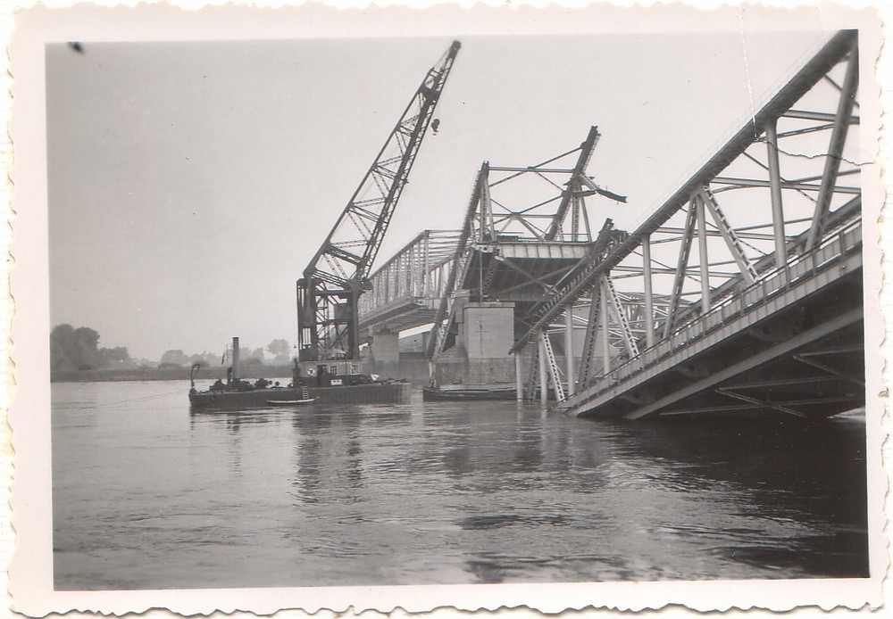 Verwoeste spoorbrug bij Hedel