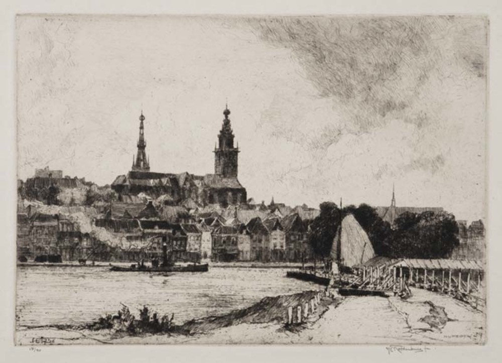 Gezicht op Nijmegen vanaf begin aanlegsteiger gierpont