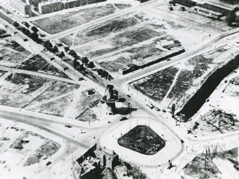 Luchtfoto Rotterdam, Oostplein, na 14 mei 1940