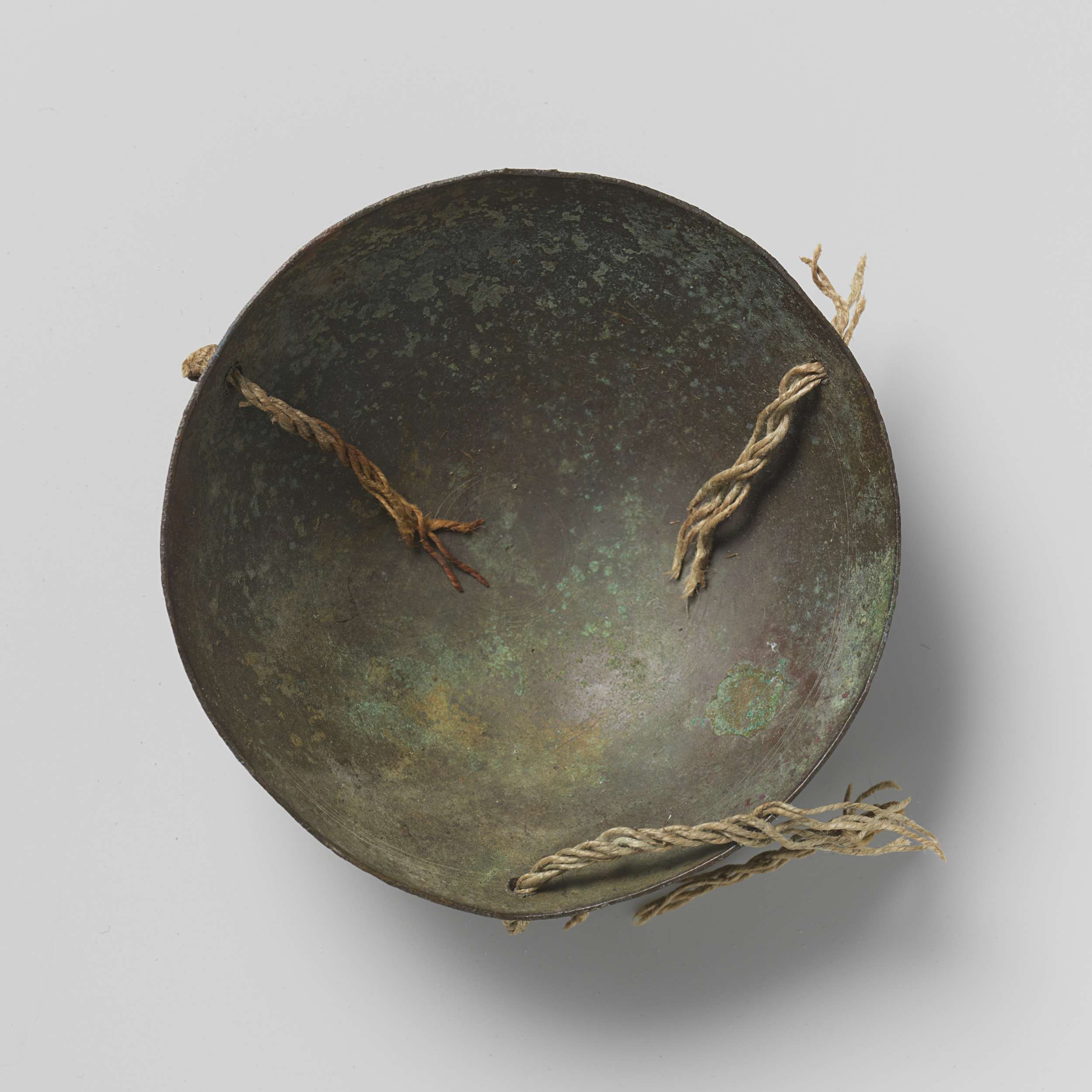 Weegschaal van koper, rond, bolvormig met drie gaatj...