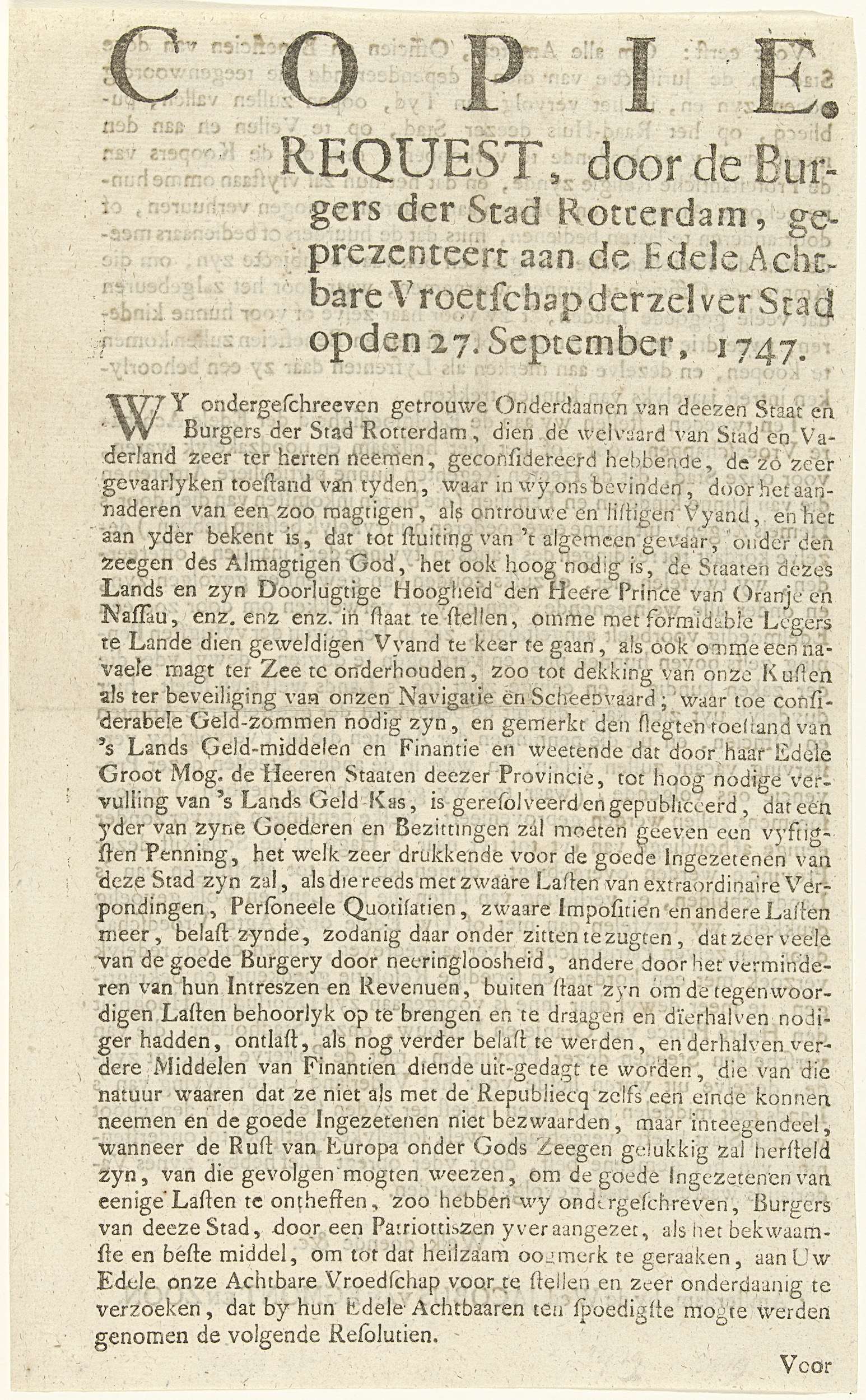 Biljet voor de Liberale Gifte gevraagd in 1747