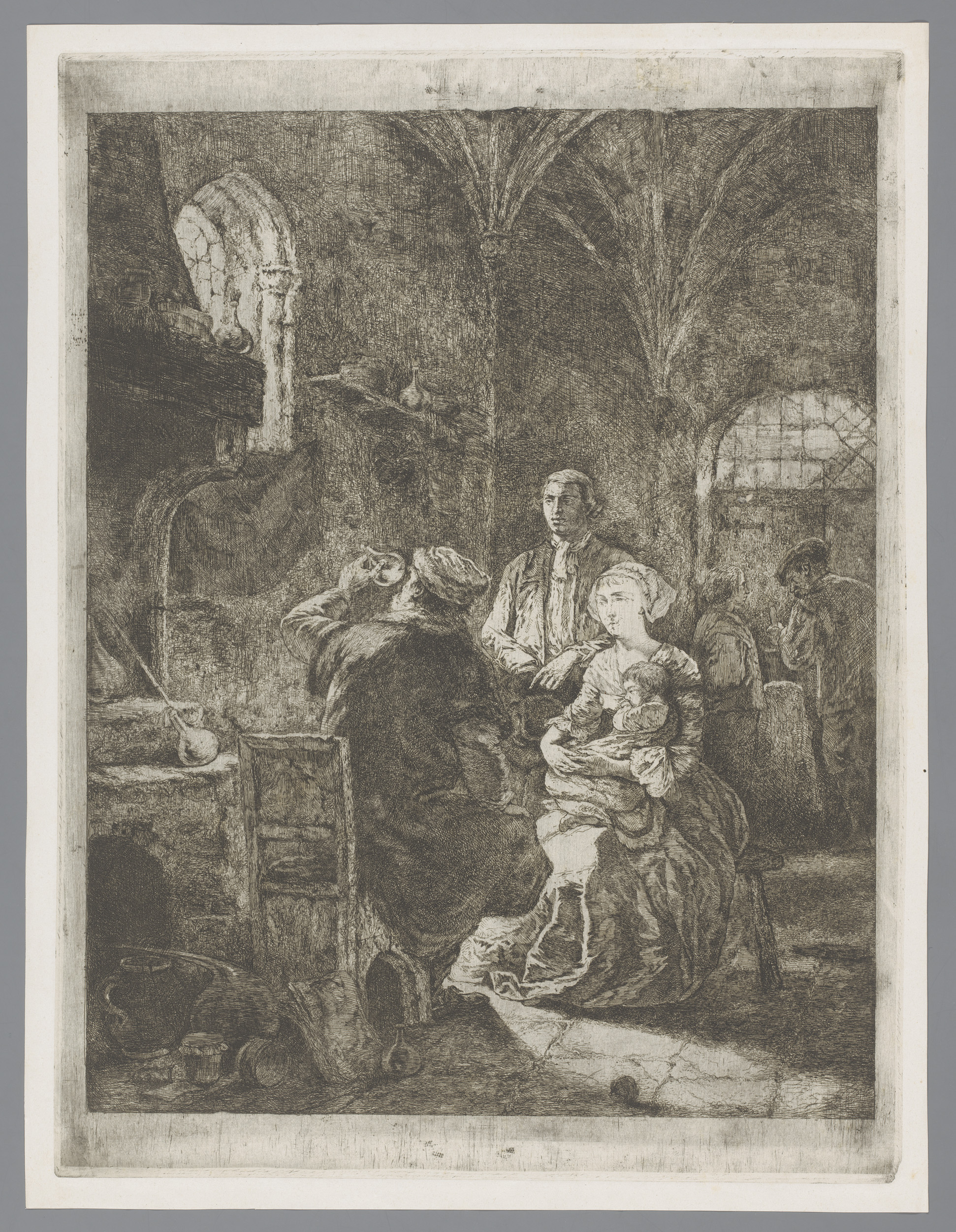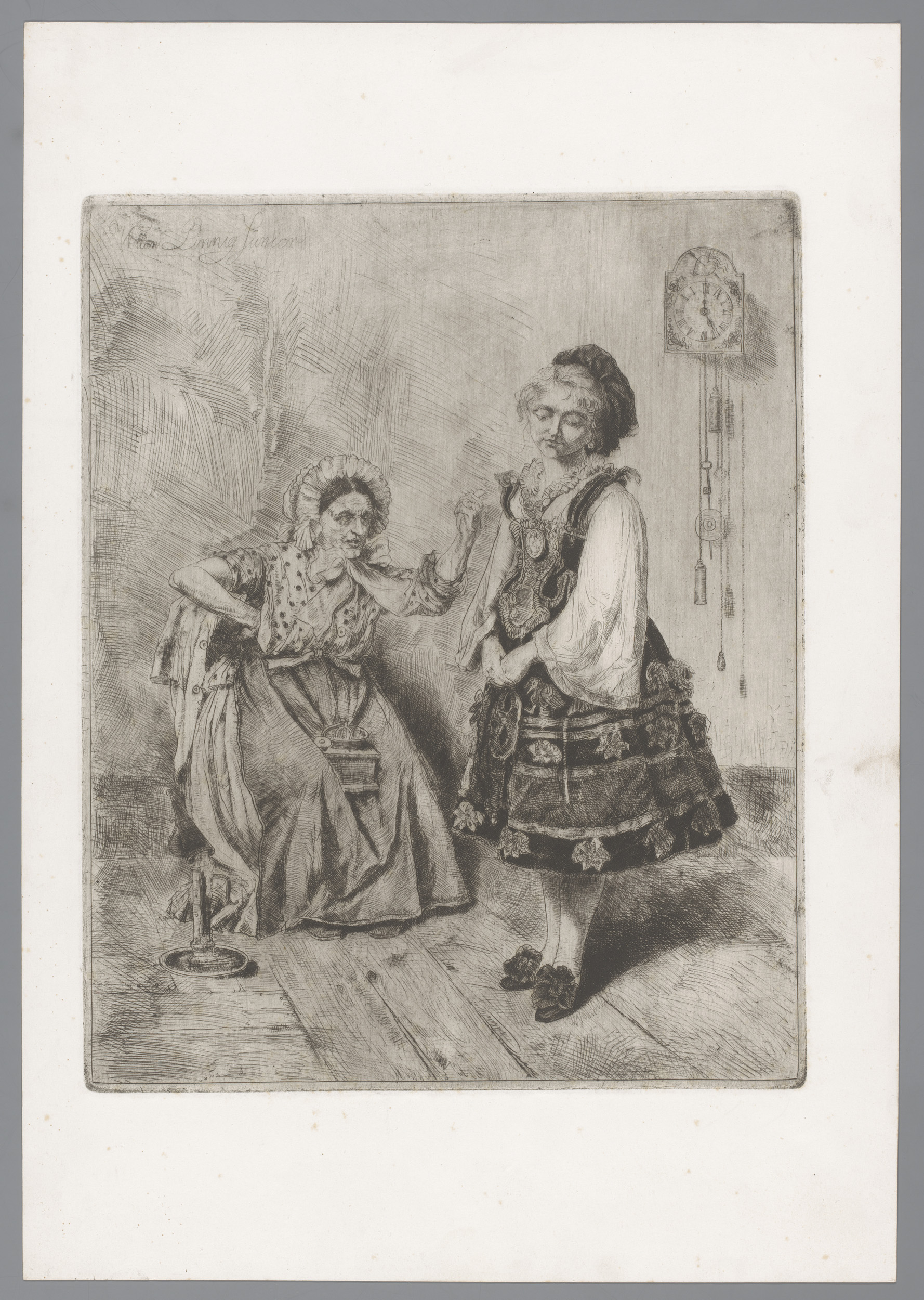 Vrouw met een lantaarn spreekt met een oude man in e...