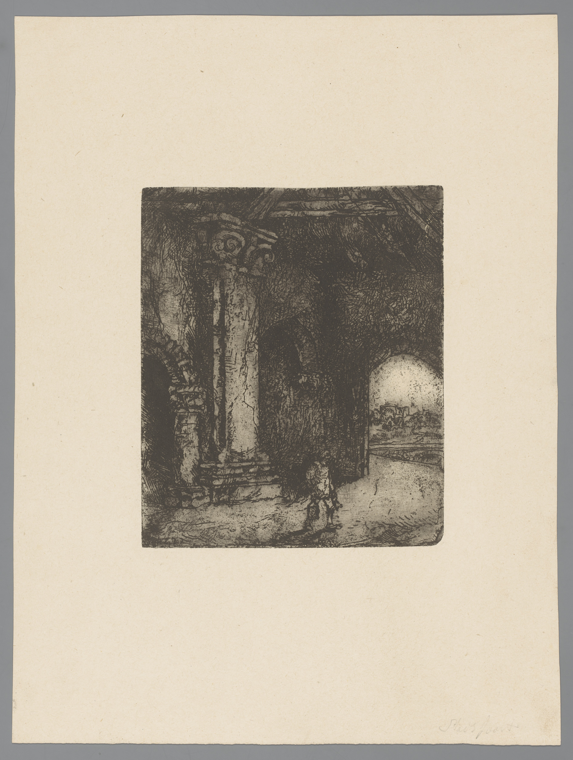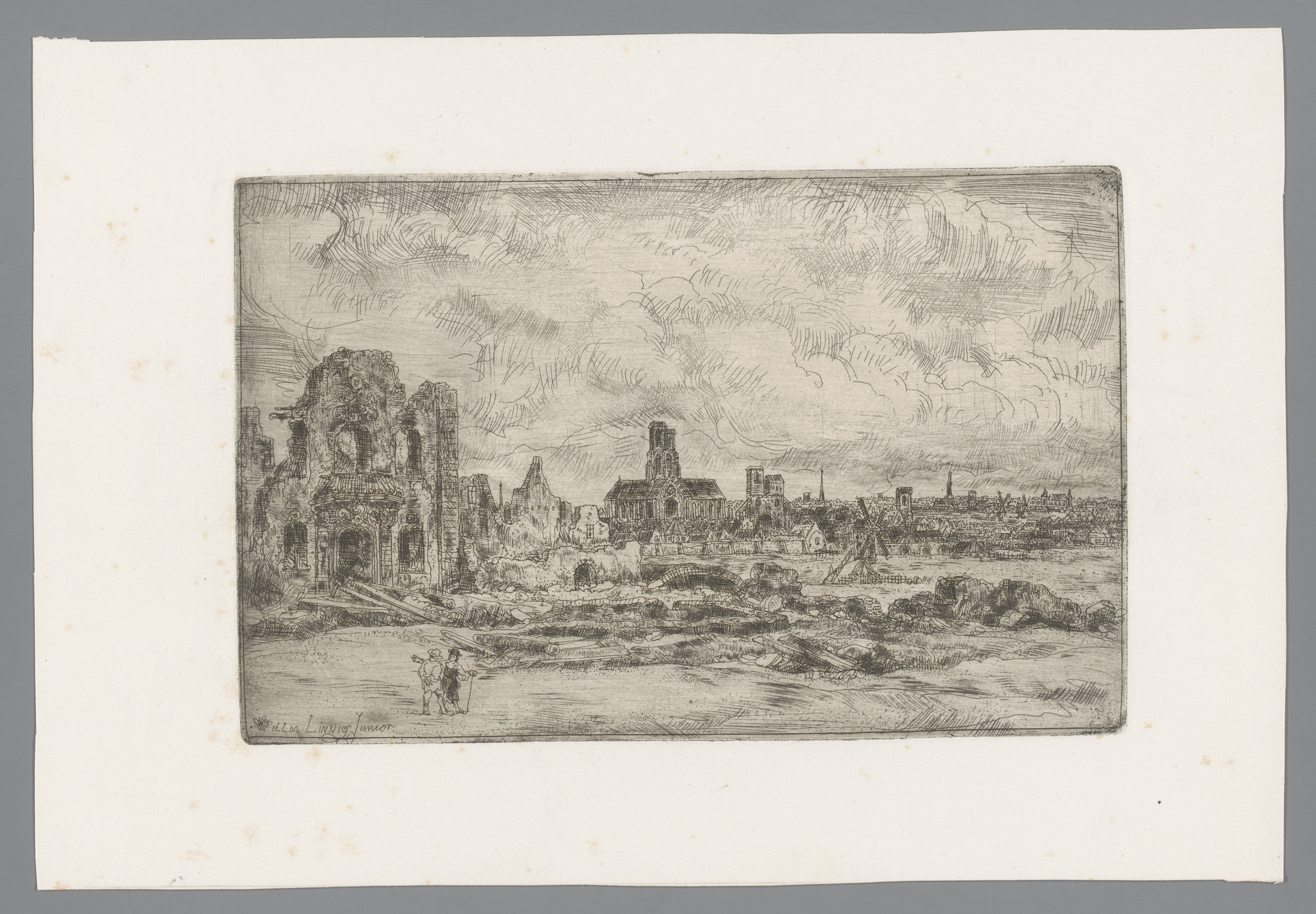 Stadsgezicht met een ruïne en twee figuren op de voo...