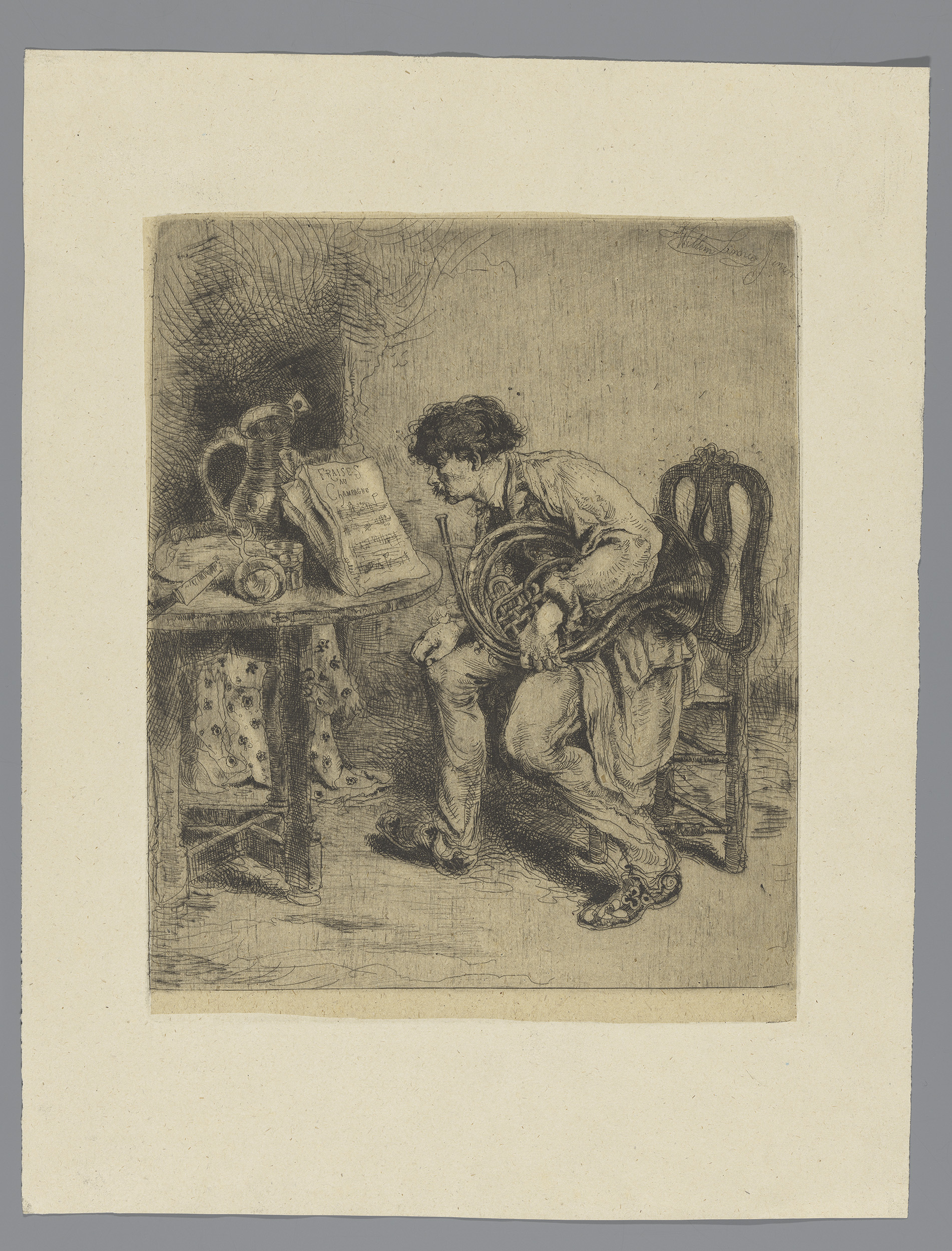 Hoornist bestudeert de bladmuziek Fraises au Champagne