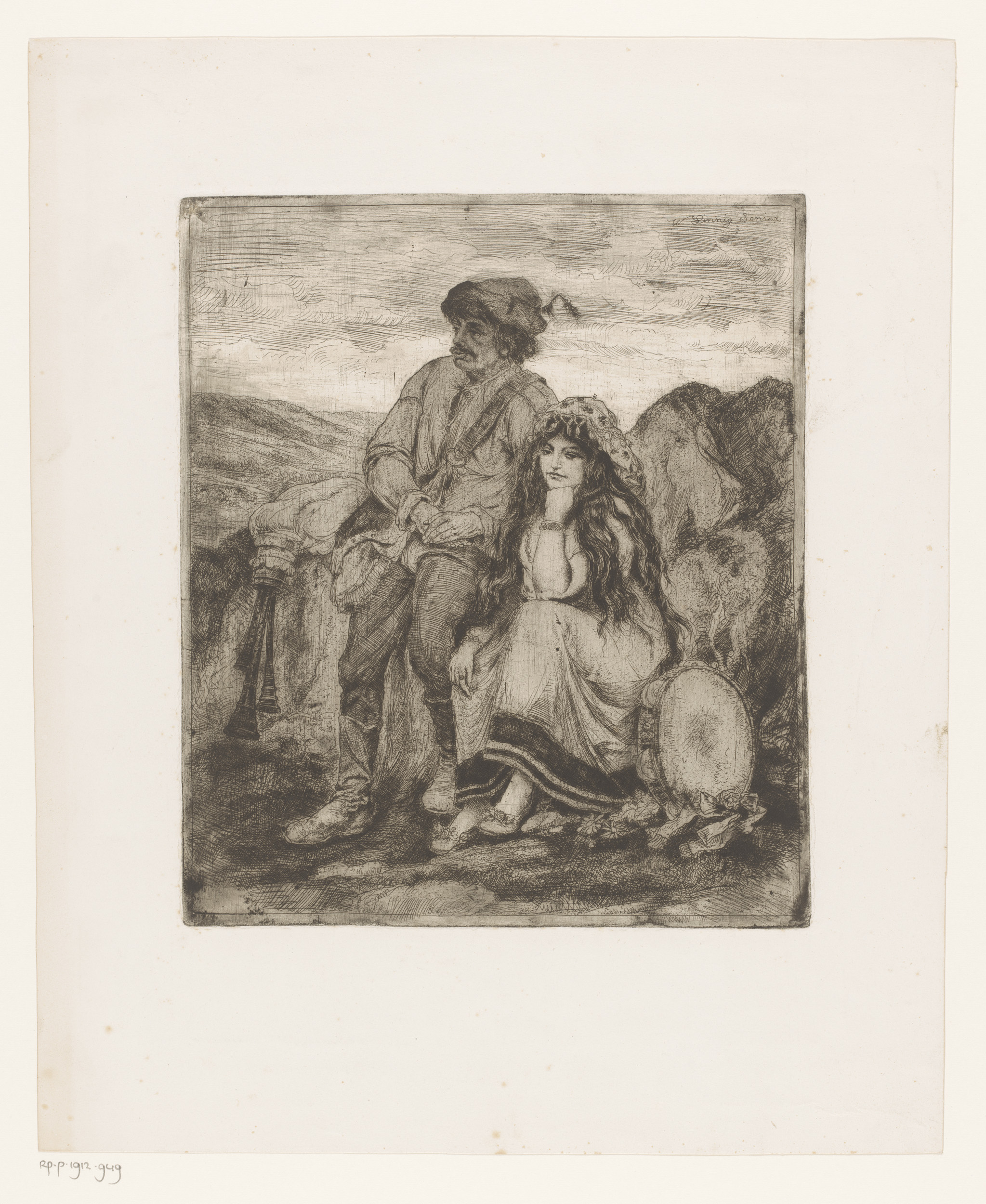 Rustend paar muzikanten met doedelzak en tamboerijn