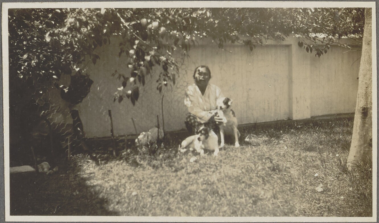 Alex en Frieda Broex met hond op veranda van woning ...