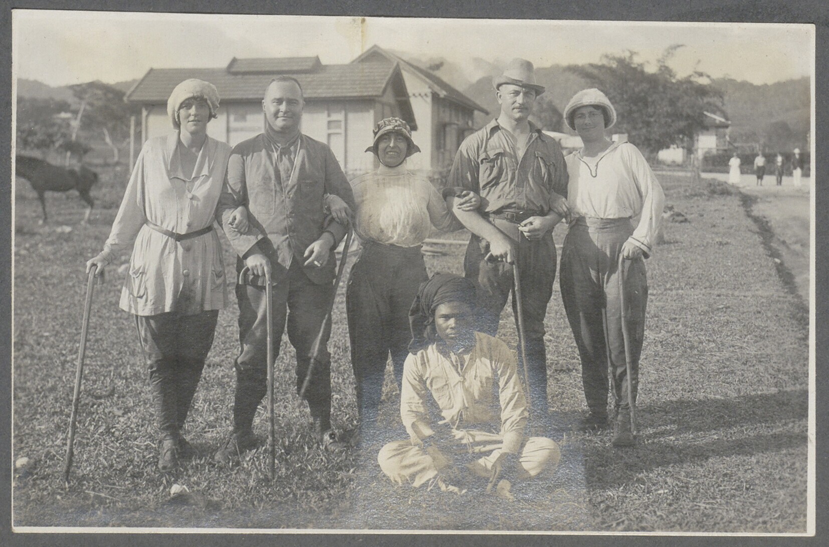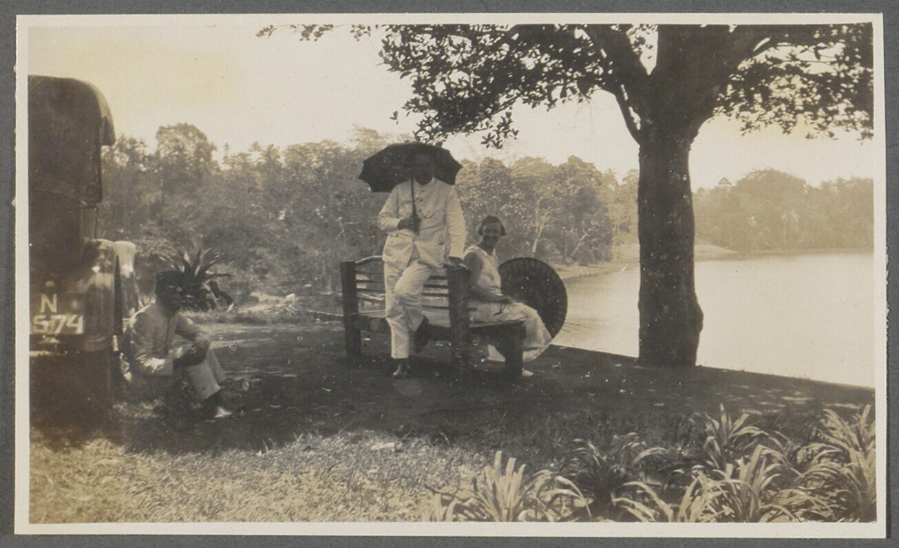 Europese man en vrouwen bij Javaanse draagstoel; op ...
