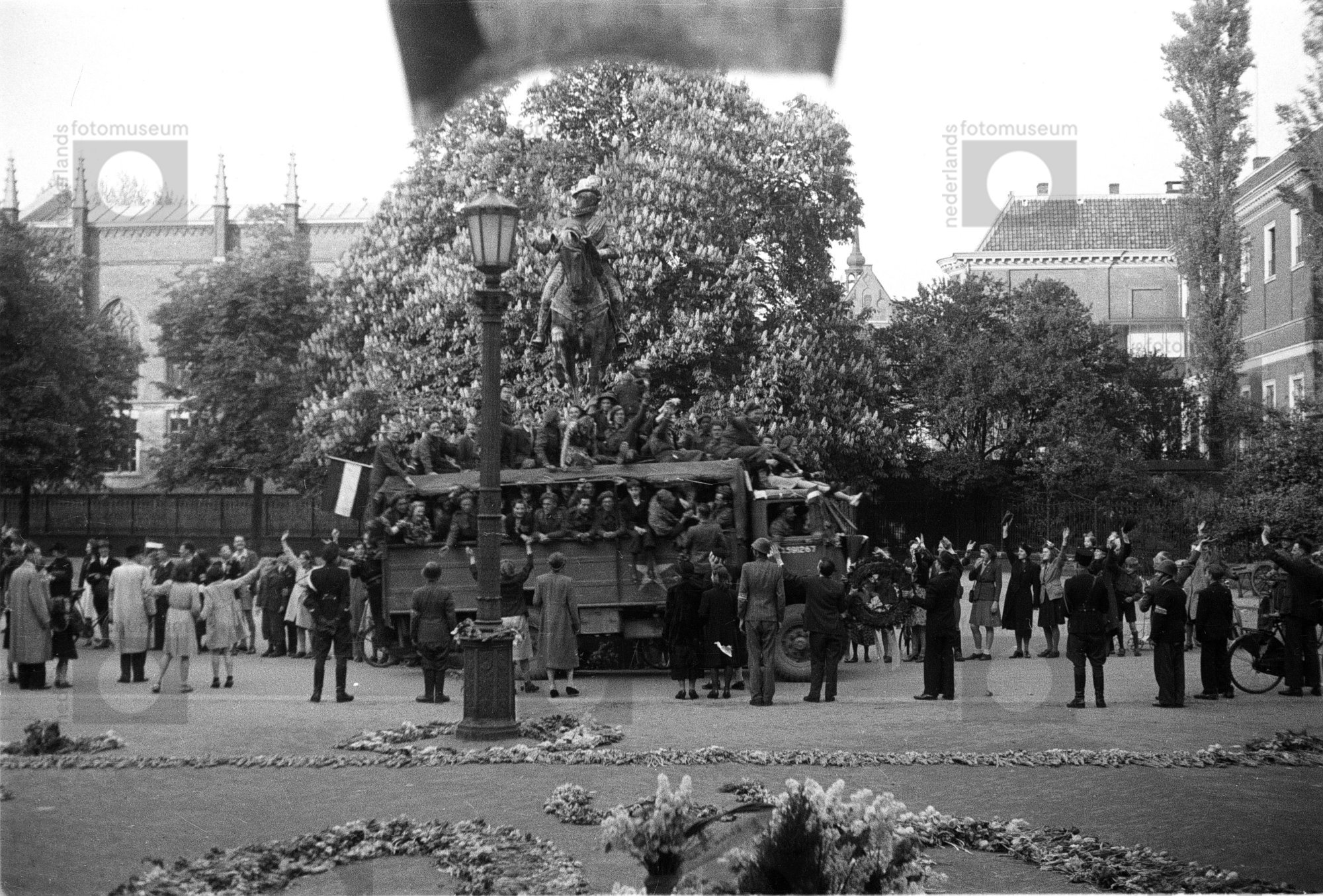 Geallieerde voertuigen rijden tijdens hun intocht vo...