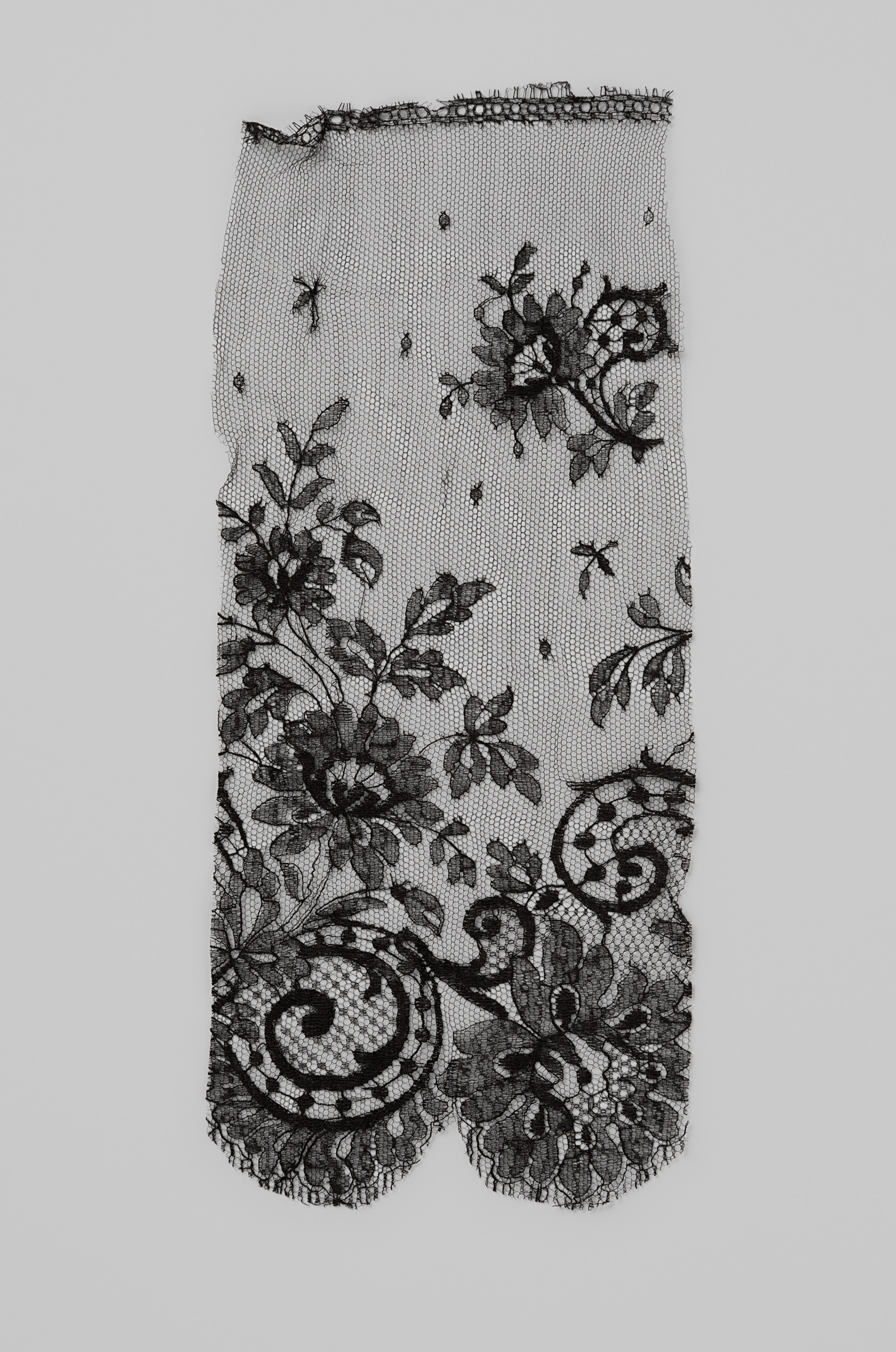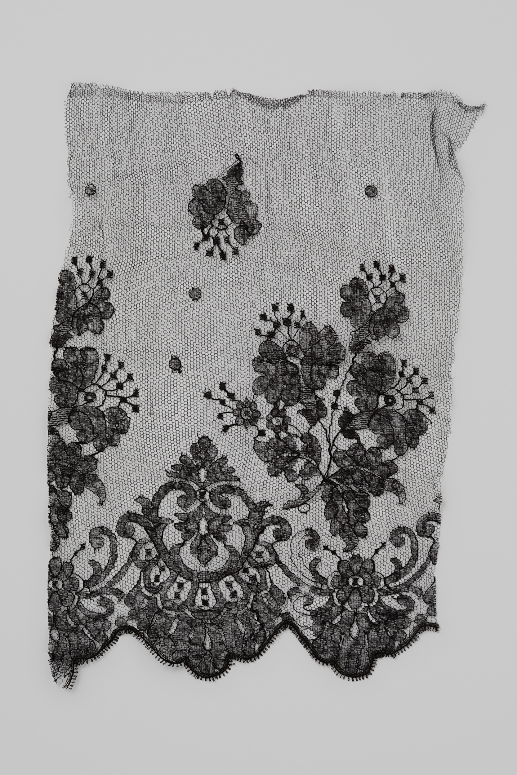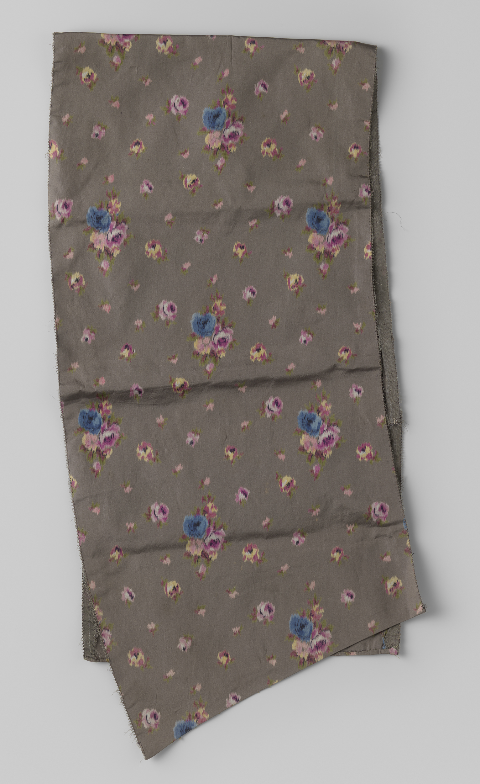 Staal van grijze chiné-zijde met motief van gestrooi...