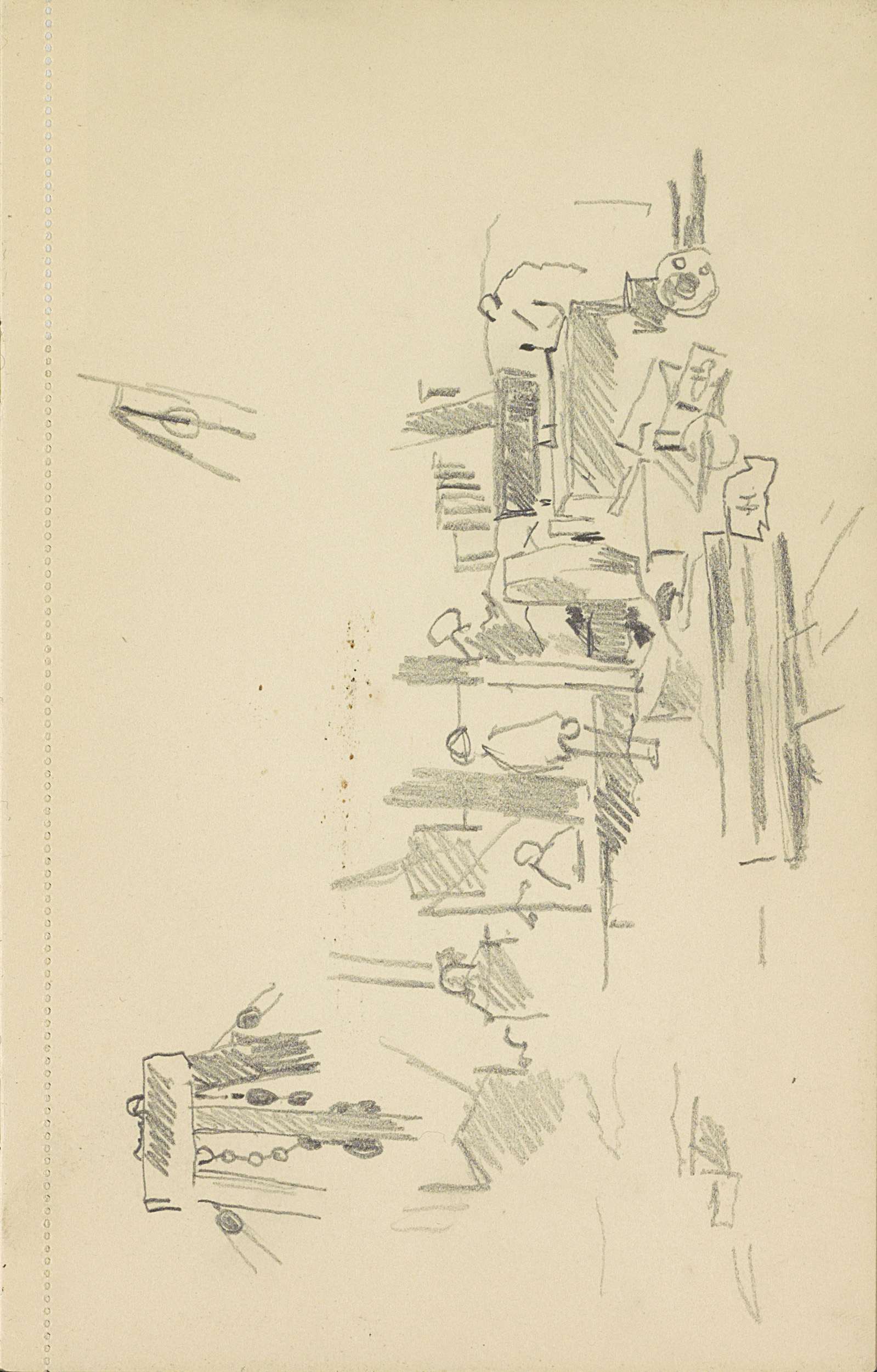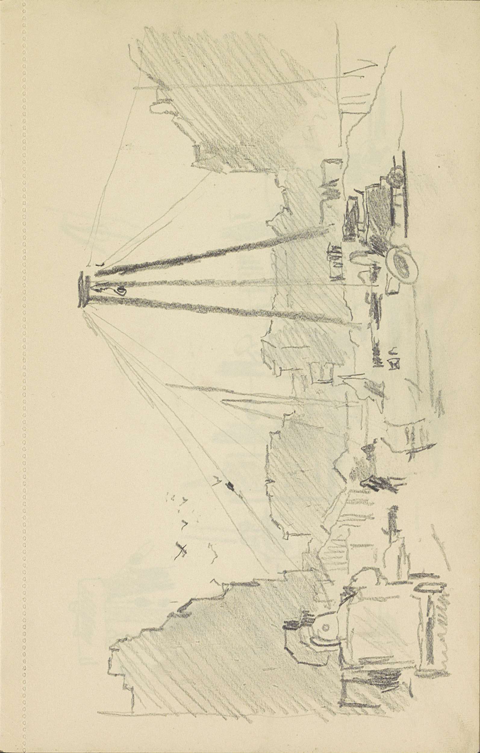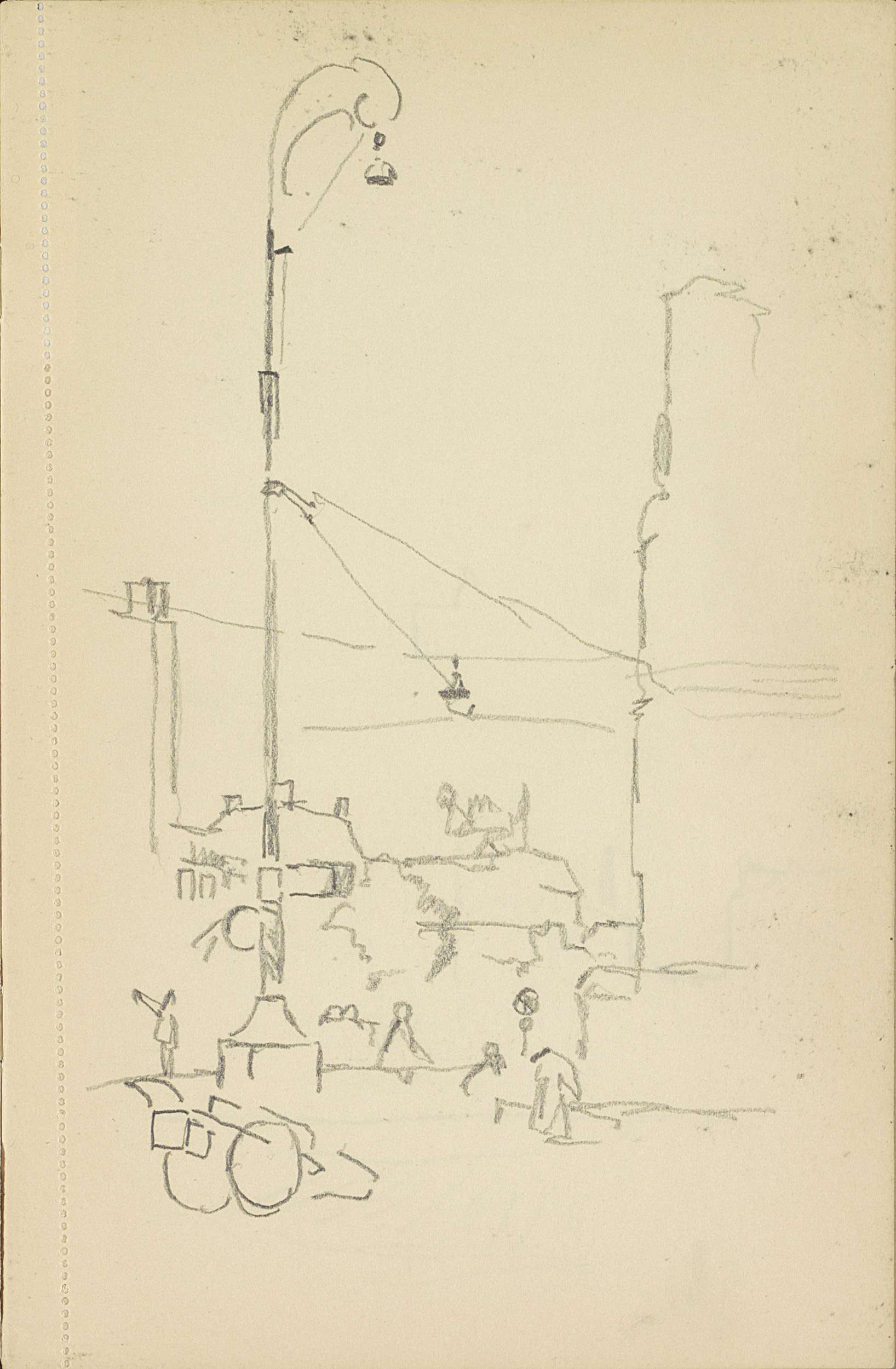 Straat met figuren, straatverlichting en een handkar