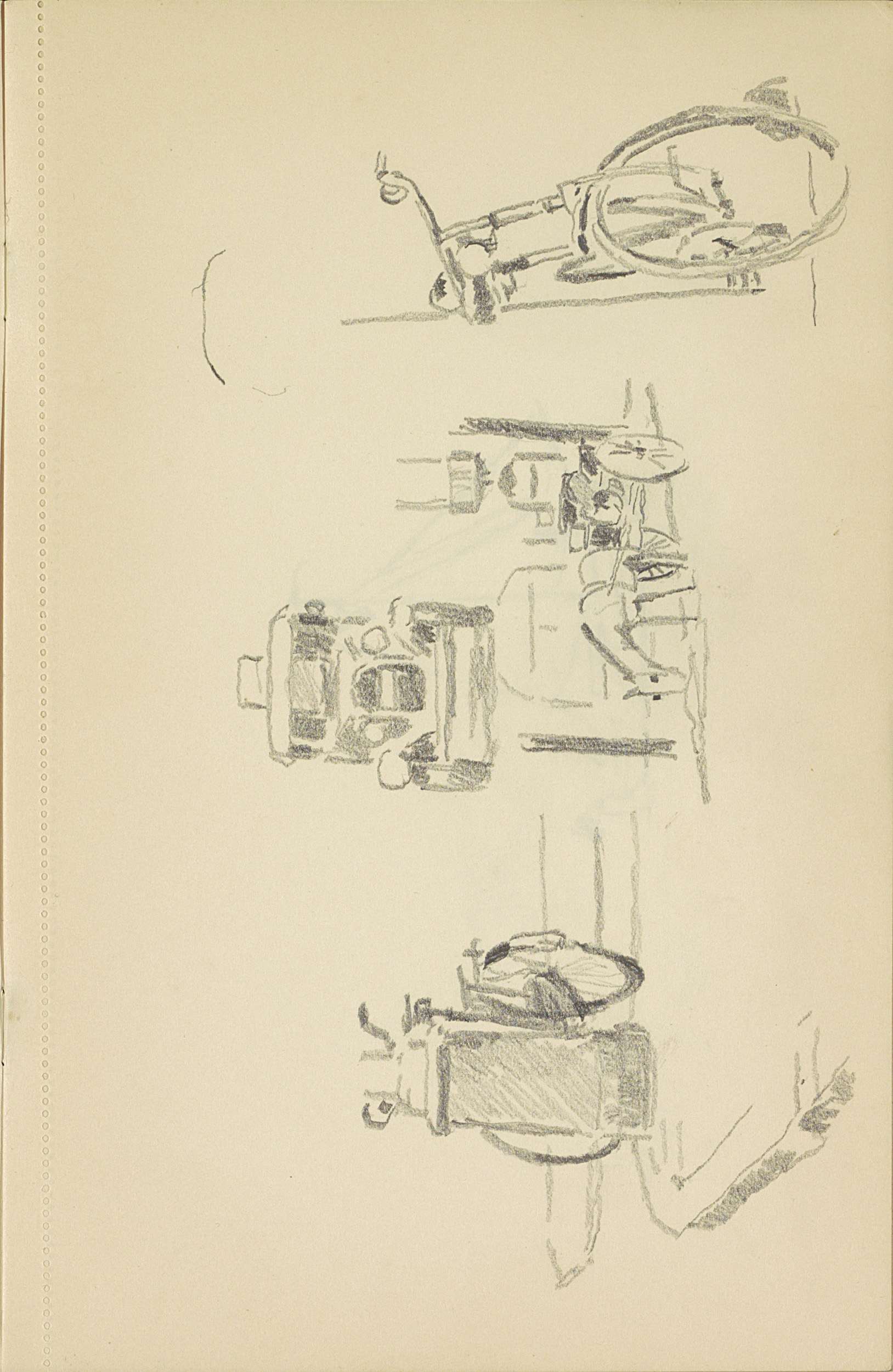 Auto, twee geparkeerde fietsen en een paardenkar