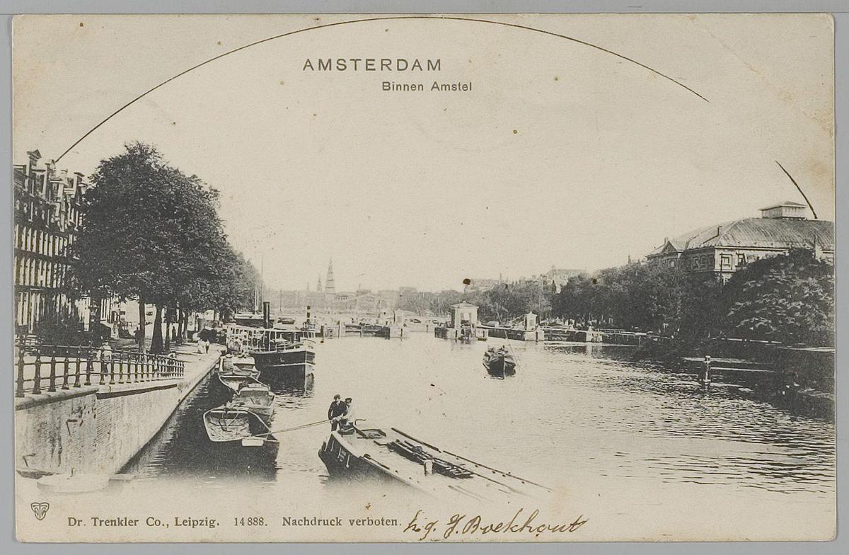 Ansichtkaart van Amsterdam, binnen Amstel en gebouw ...