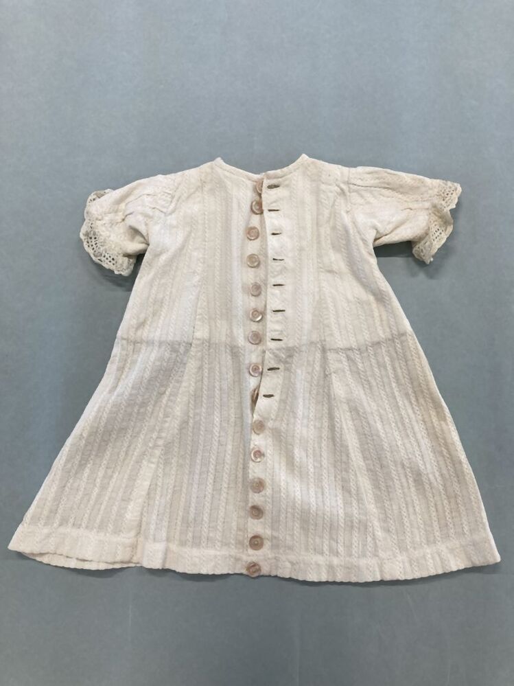 Spits ovaal kleedje van wit katoen met Frans en Enge...