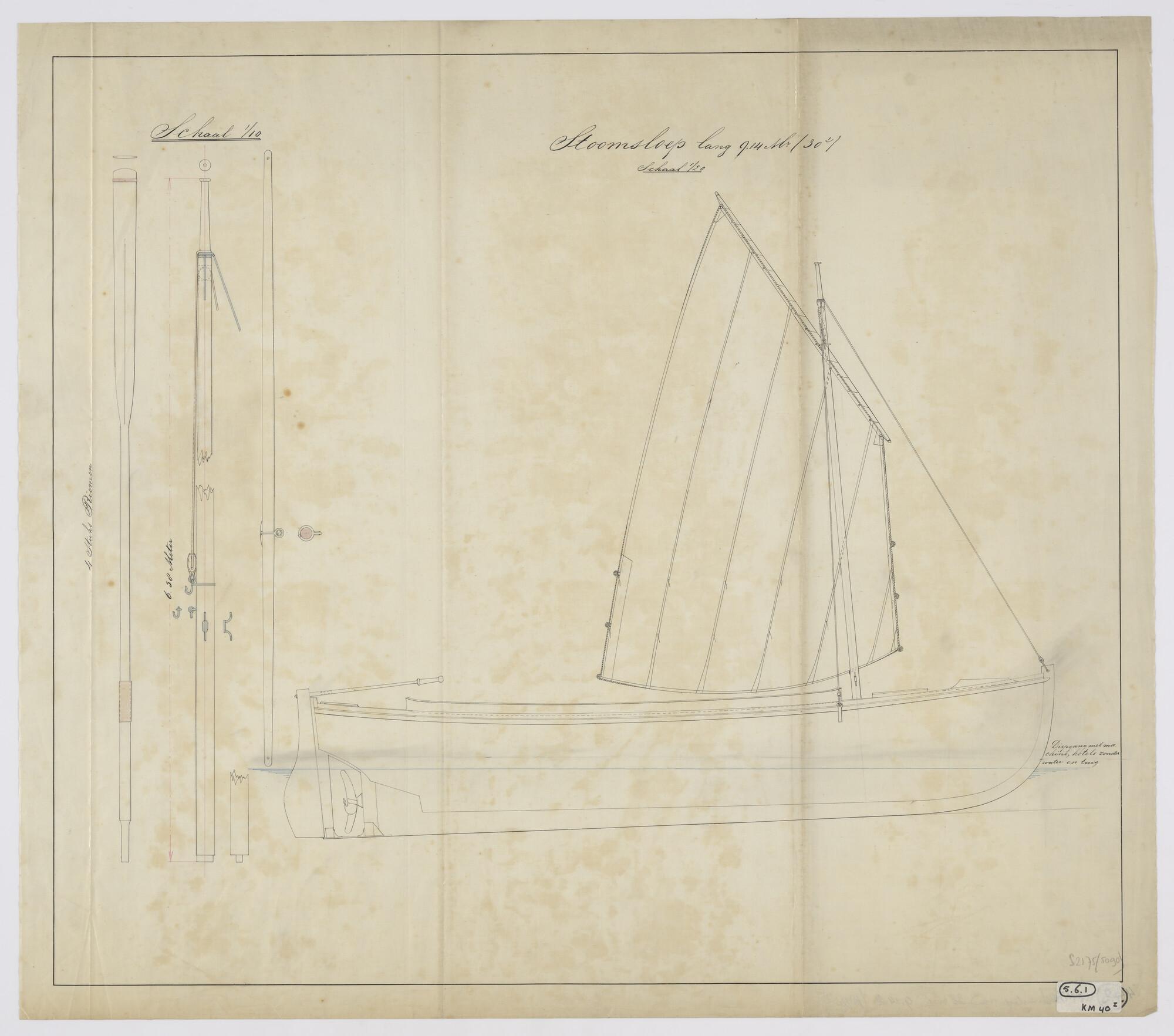 Zijaanzicht en rondhouten van de stoomsloep met zeil...