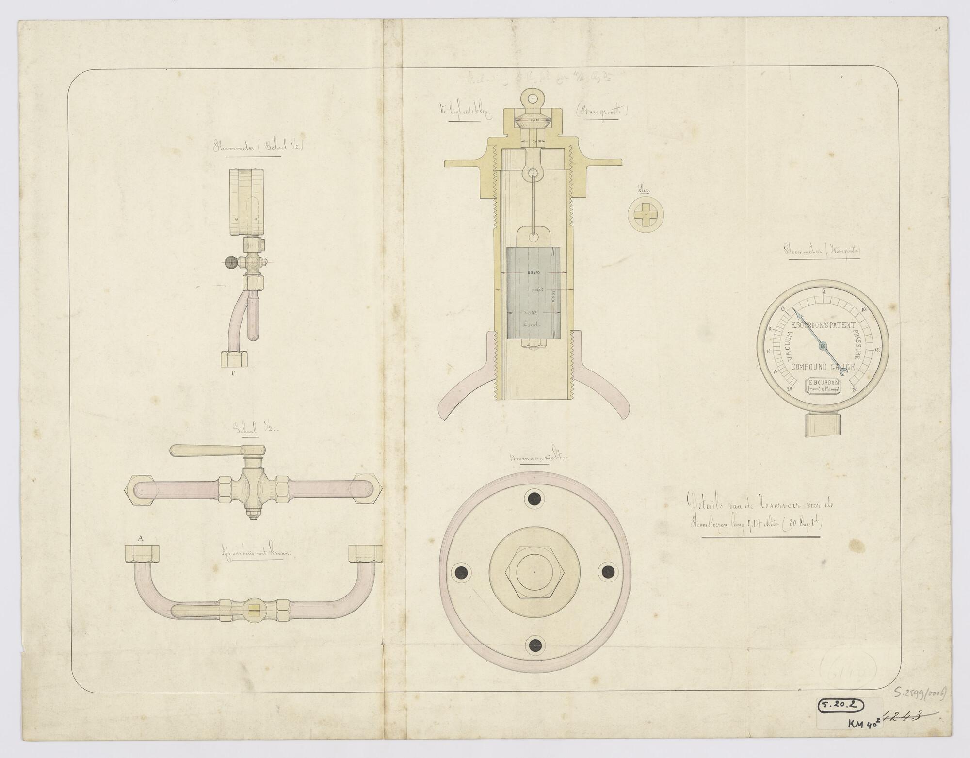 Bovenaanzicht, langsdoorsnede en dwarsdoorsneden van...