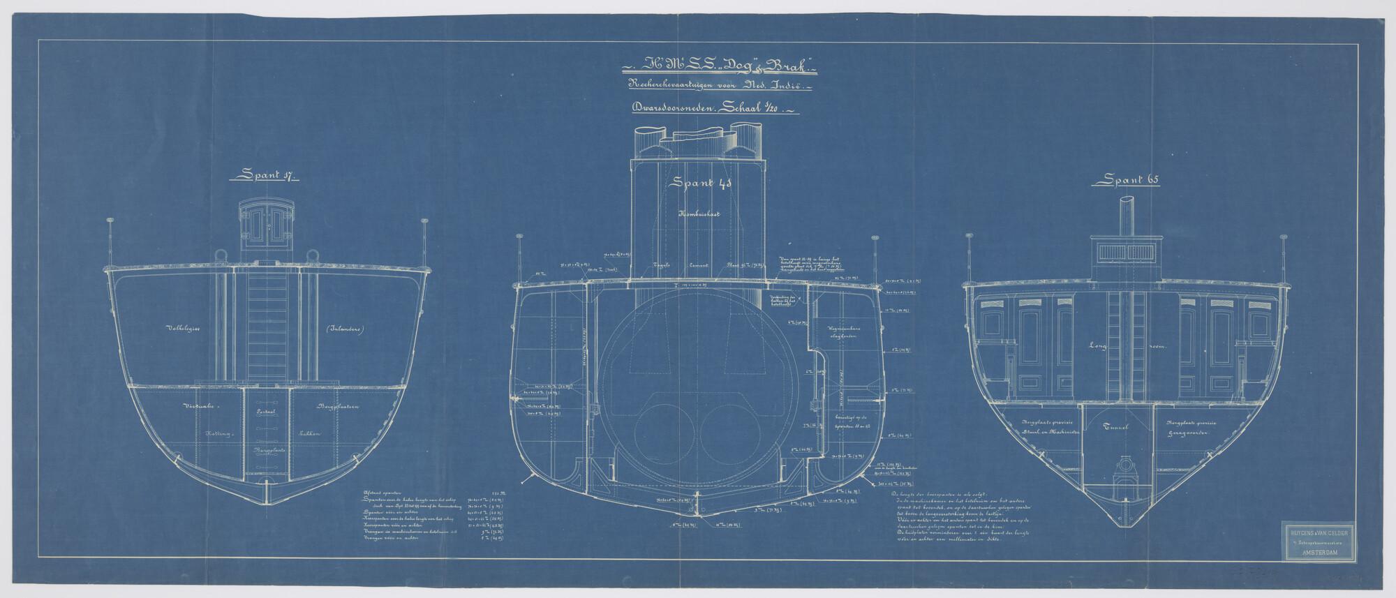 Drie dwarsdoorsneden over de spanten 17, 41 en 65 va...