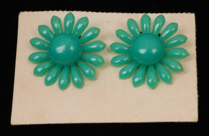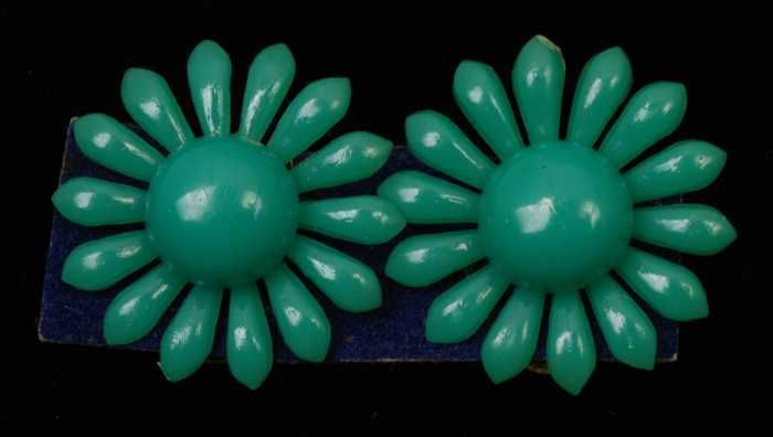 Paar oorbellen, clip met groene plastic bloem, op bl...