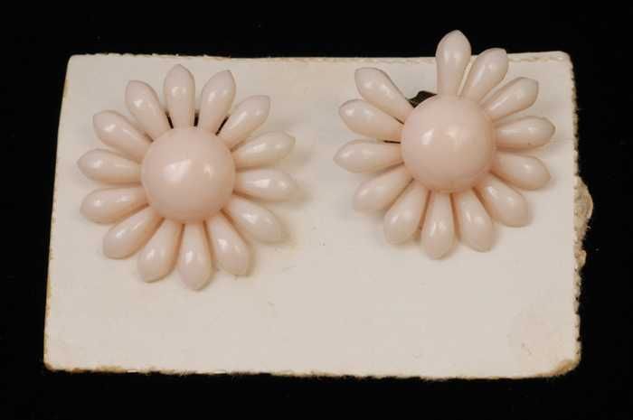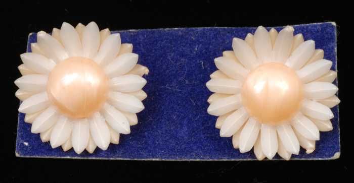 Paar oorbellen, clip met witte kunststof bloem, op k...
