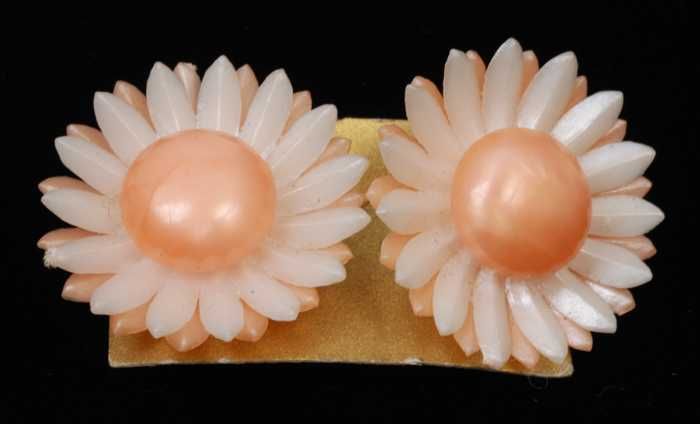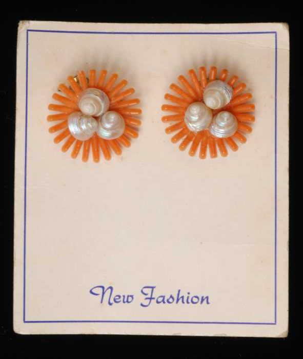 Paar oorbellen, clips met oranje plastic straalvormi...
