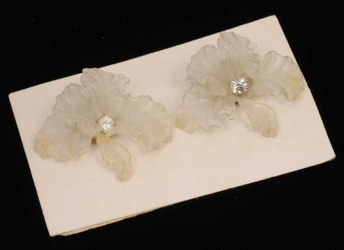 Paar oorbellen, clip met bloem van metaal, wit met g...