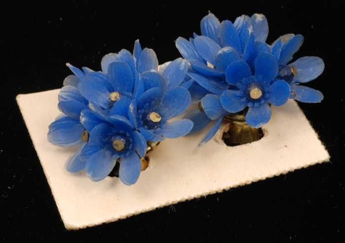 Paar oorbellen, clip met blauwe plastic bloemetjes, ...