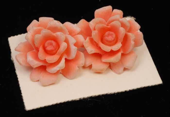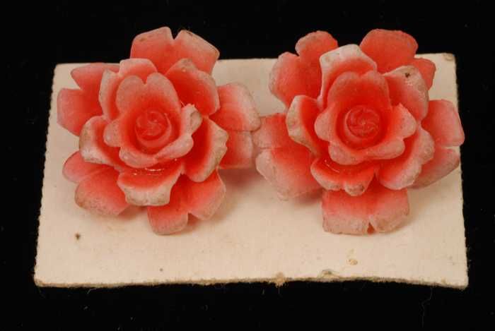 Paar oorbellen, clip met rozerode kunststof bloem, o...
