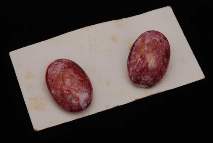Paar oorbellen, clip met ovale knop van roze-wit gem...