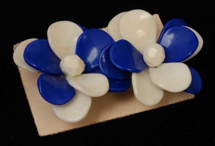 Paar oorbellen, clip met bloem van blauw en wit plas...