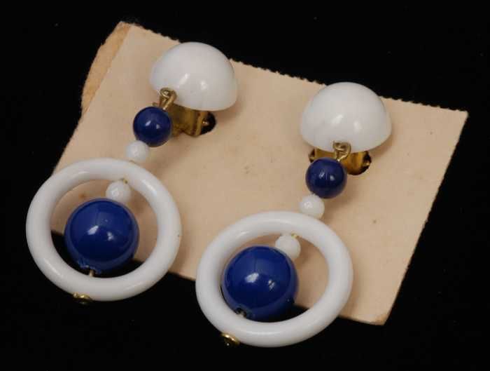 Drie paar oorbellen, clip met ronde blauwe plastic k...