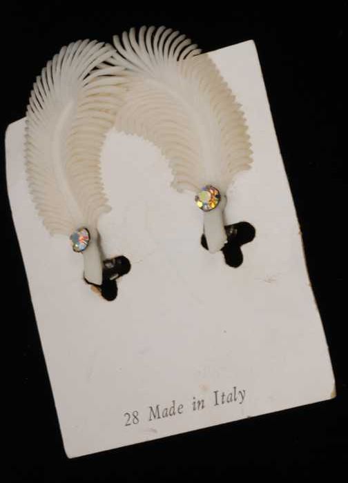 Paar oorbellen, clip met hanger van wit plastic, vee...