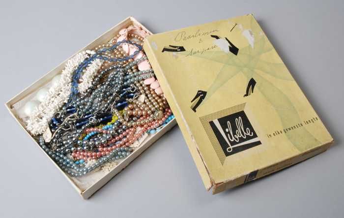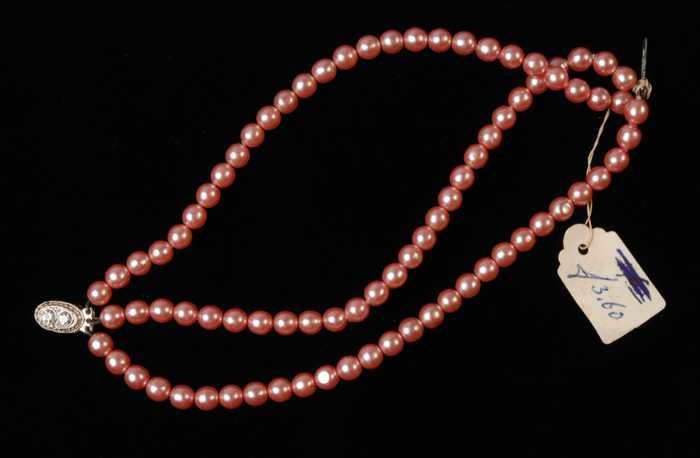 Gebroken halsketting, drie snoeren champagnekleurige...