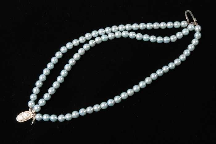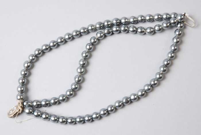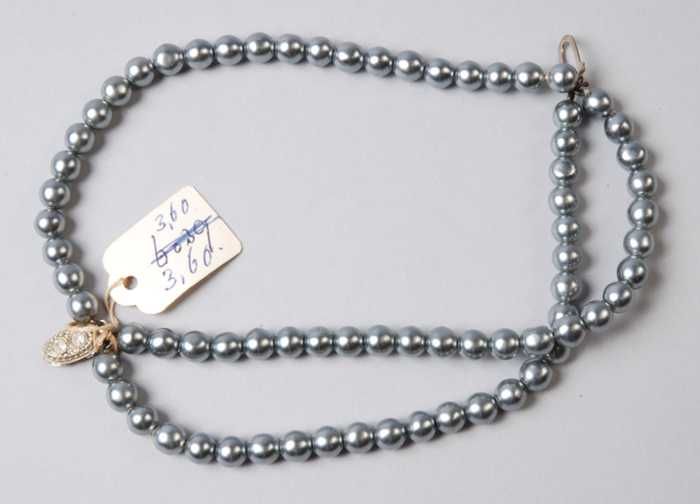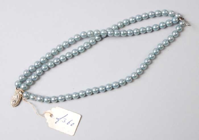 Armband, drie snoeren blauwgrijze paarlemoerglanzend...