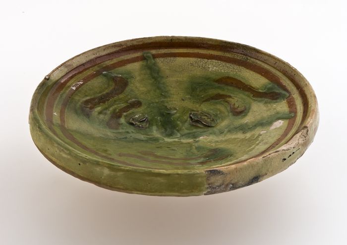 Klein aardewerk bord op klein standvlak, versierd me...