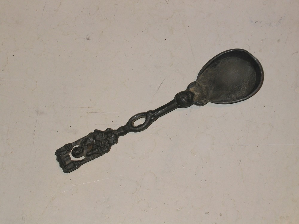 Tinnen lepel met figuur van een uit het raam hangend...