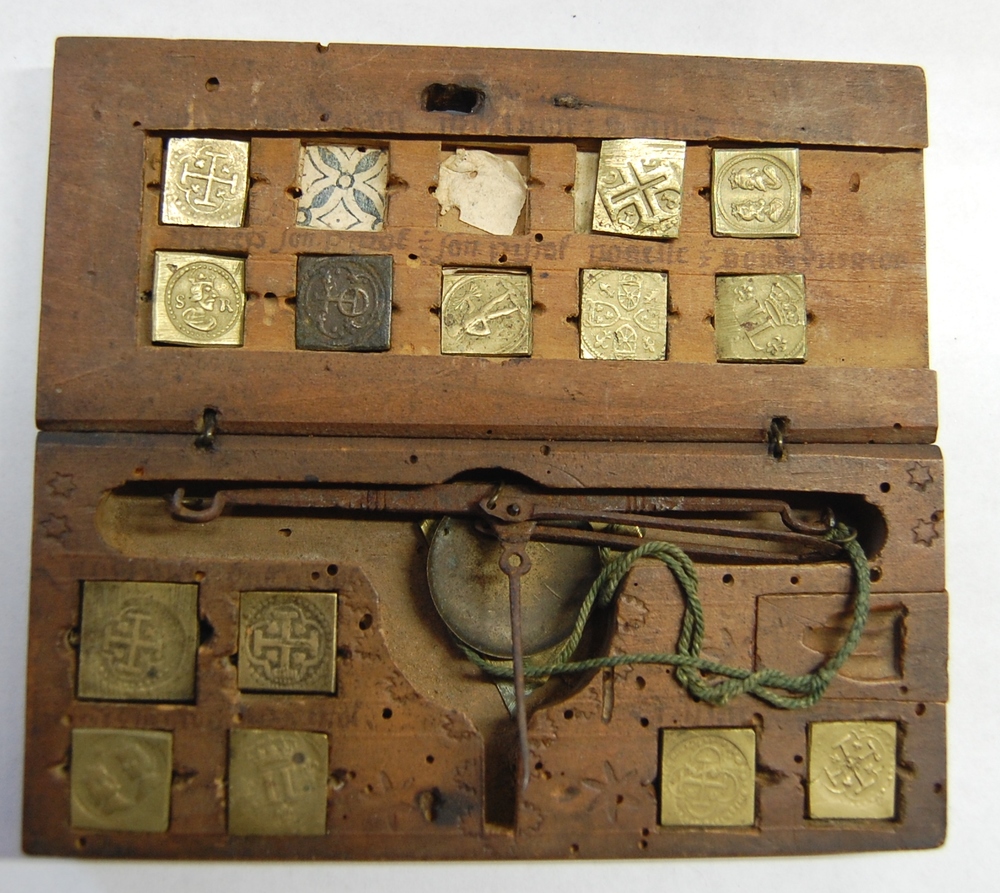 muntgewichtdoos met ijzeren balans, driehoekig schaa...