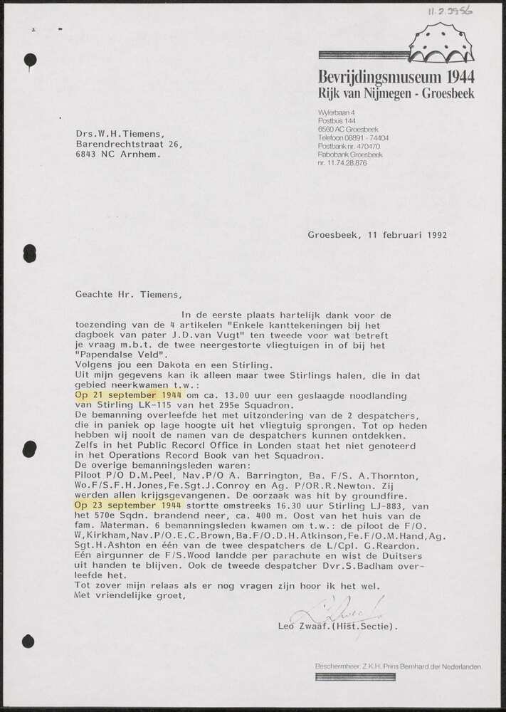 Brief van dhr. Tiemens, Arnhem 5 februari 1992.