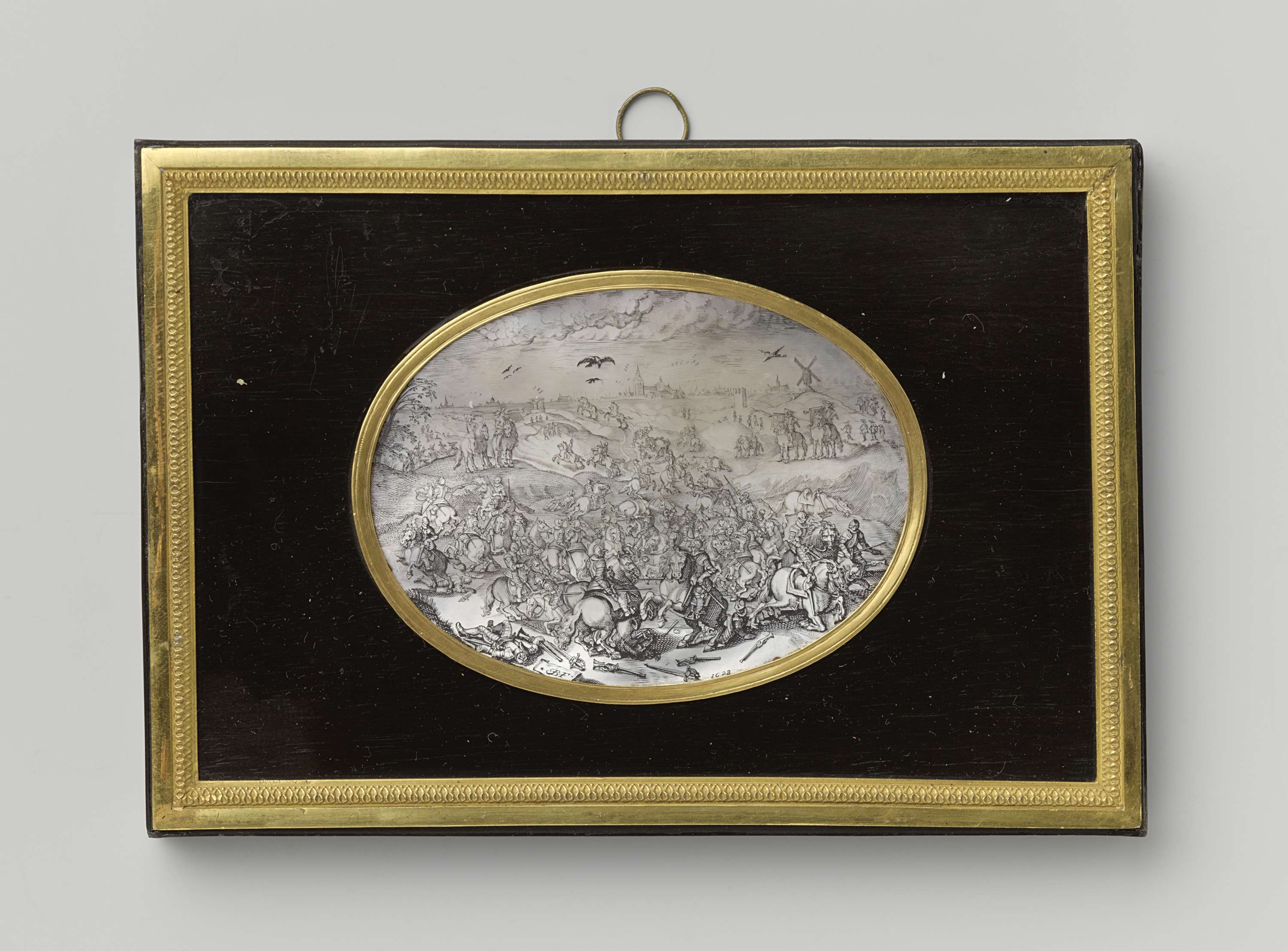 Gravure op parelmoer tonend het ruiterduel tussen bu...