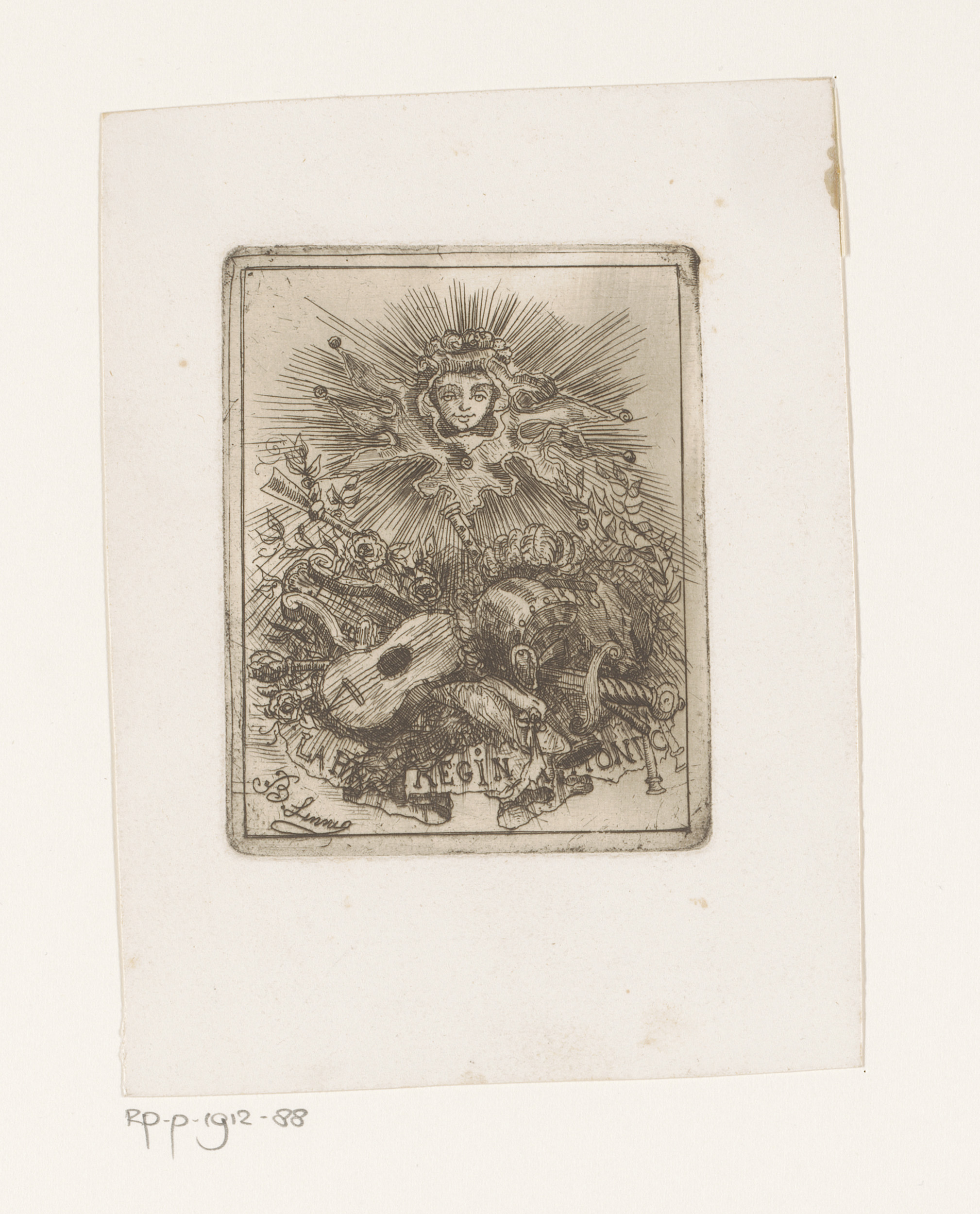 Vignet met muziekinstrumenten onder een gezicht omge...