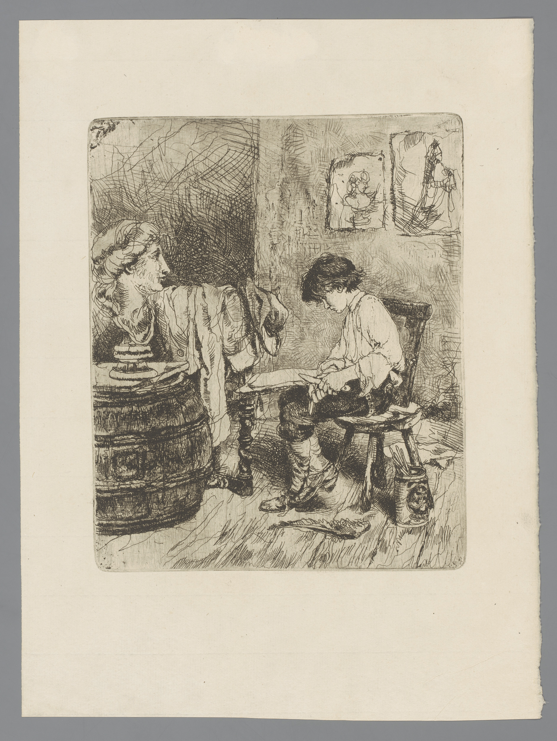 In een atelier zit een jongen tegenover een borstbee...