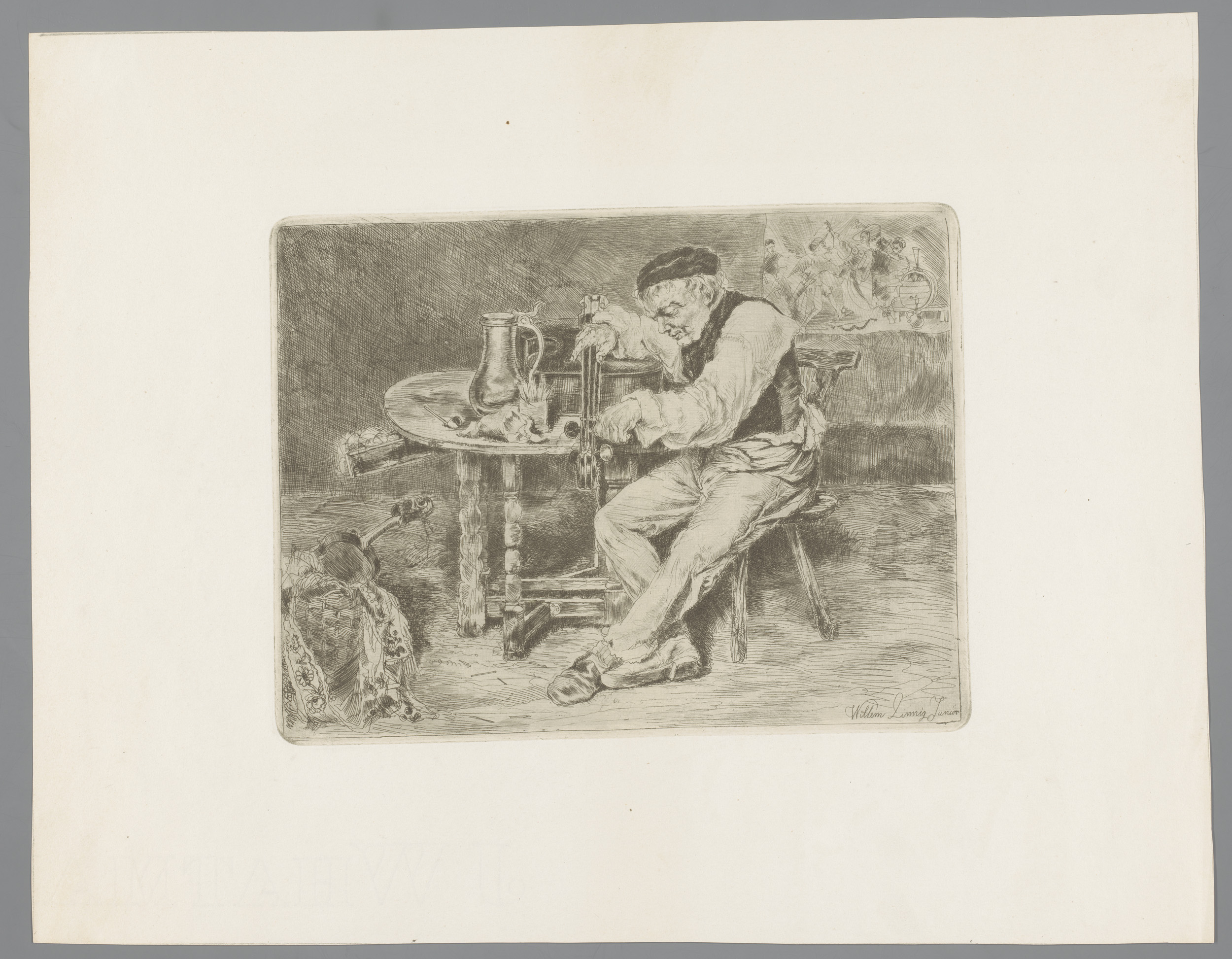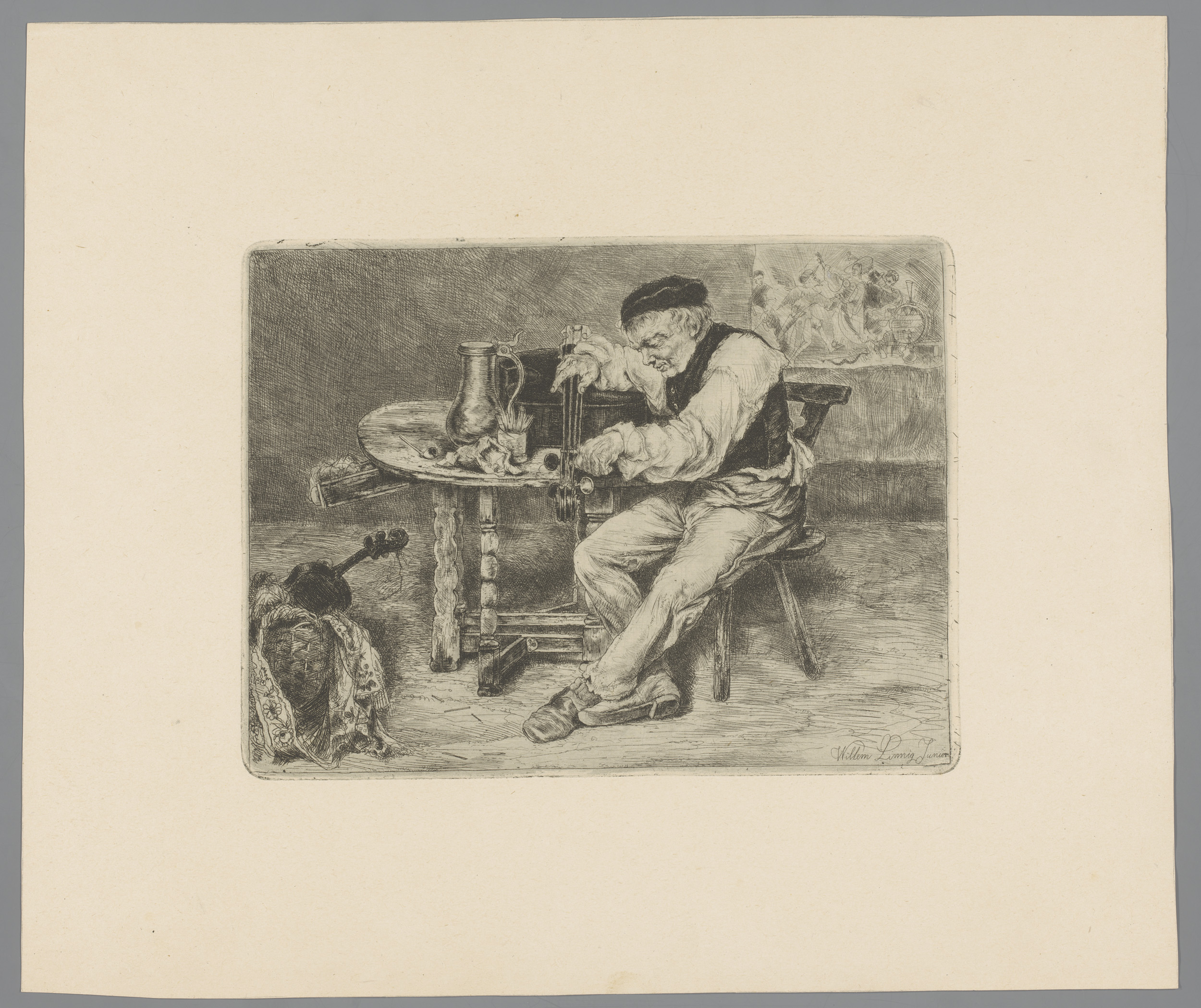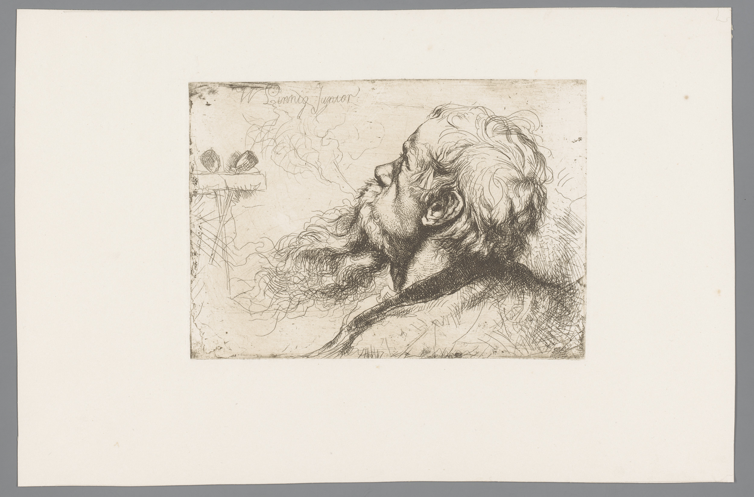 Portret van Willem Linnig senior, rook uitblazend