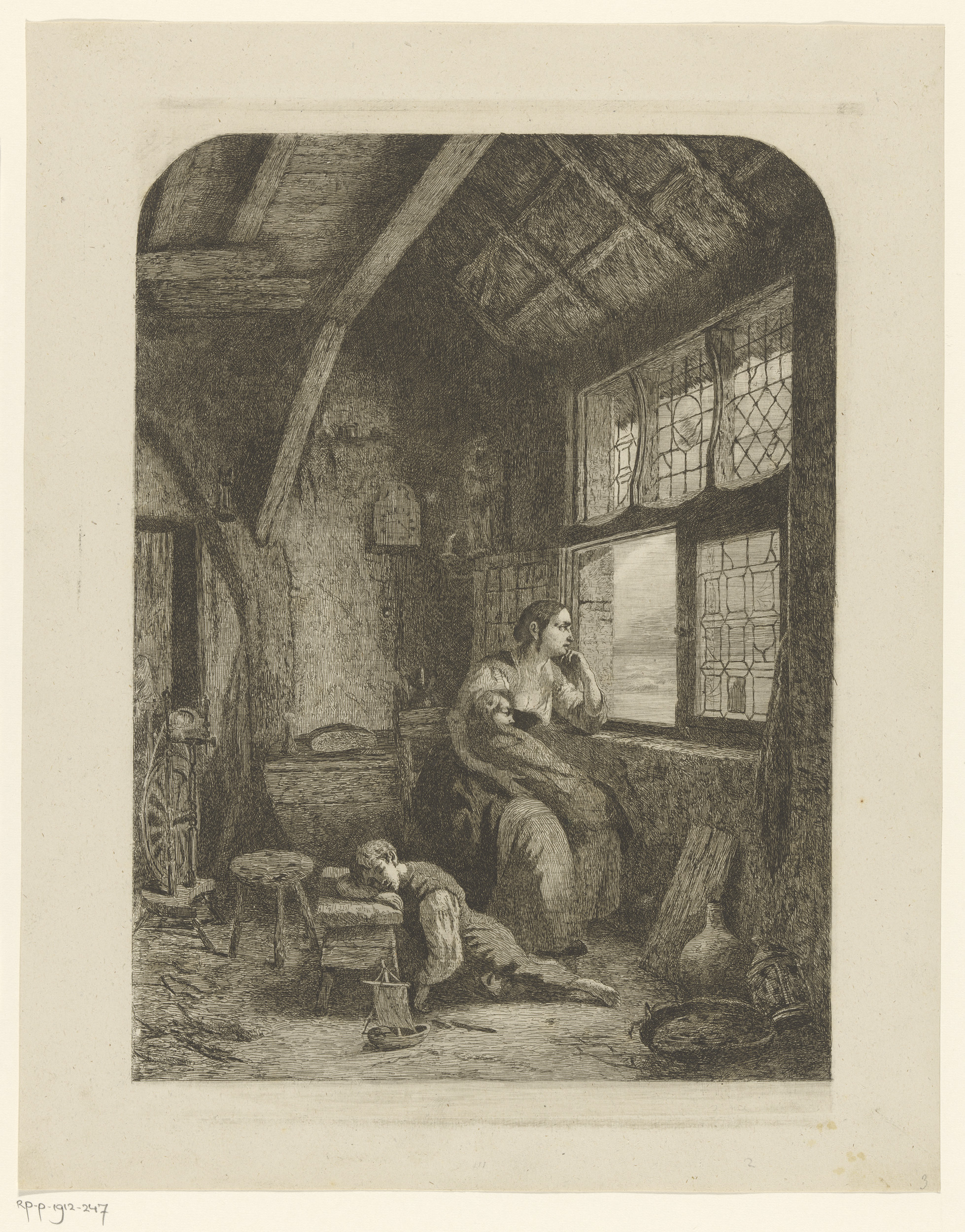 Vrouw met twee slapende kinderen wachtend bij een op...