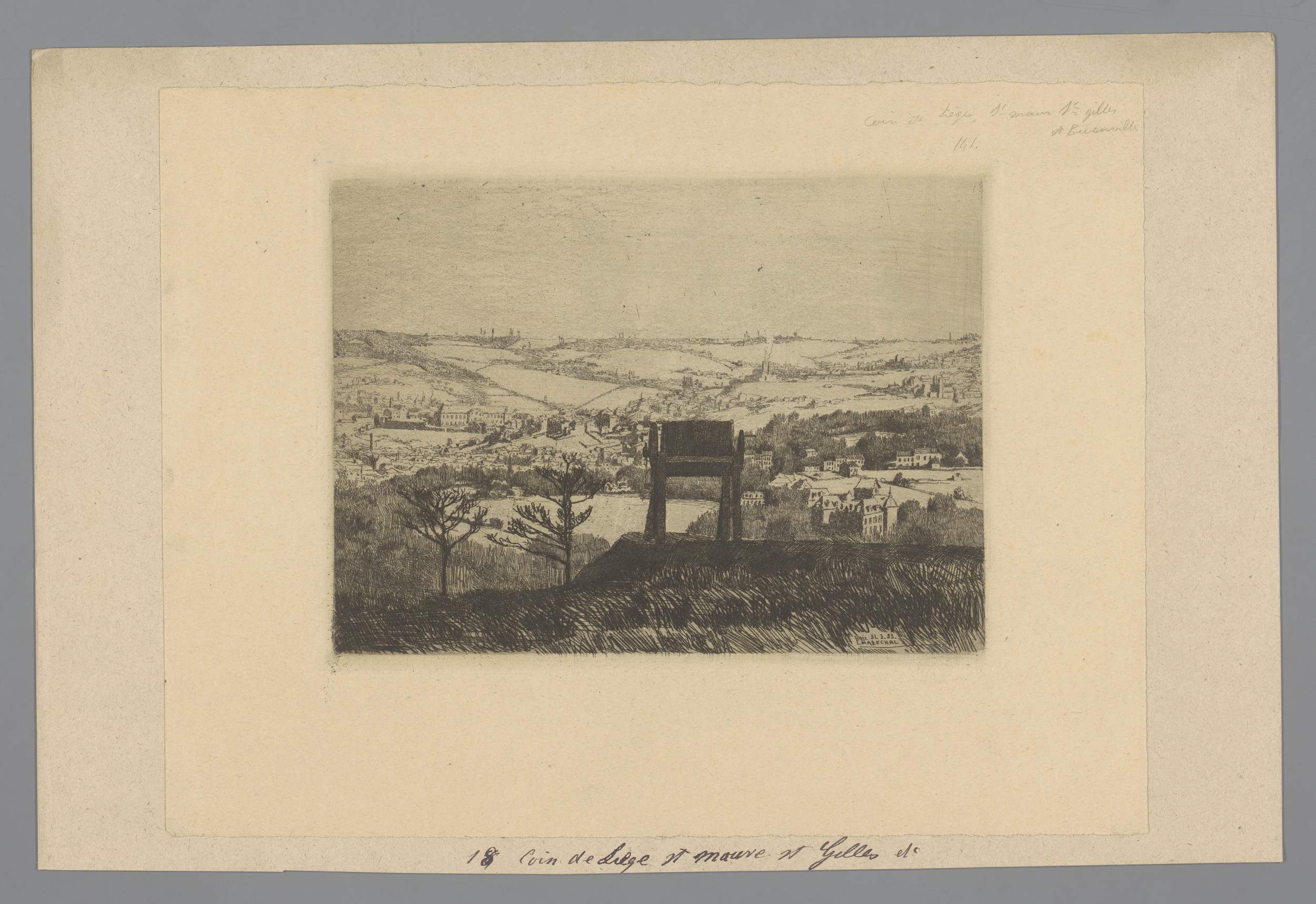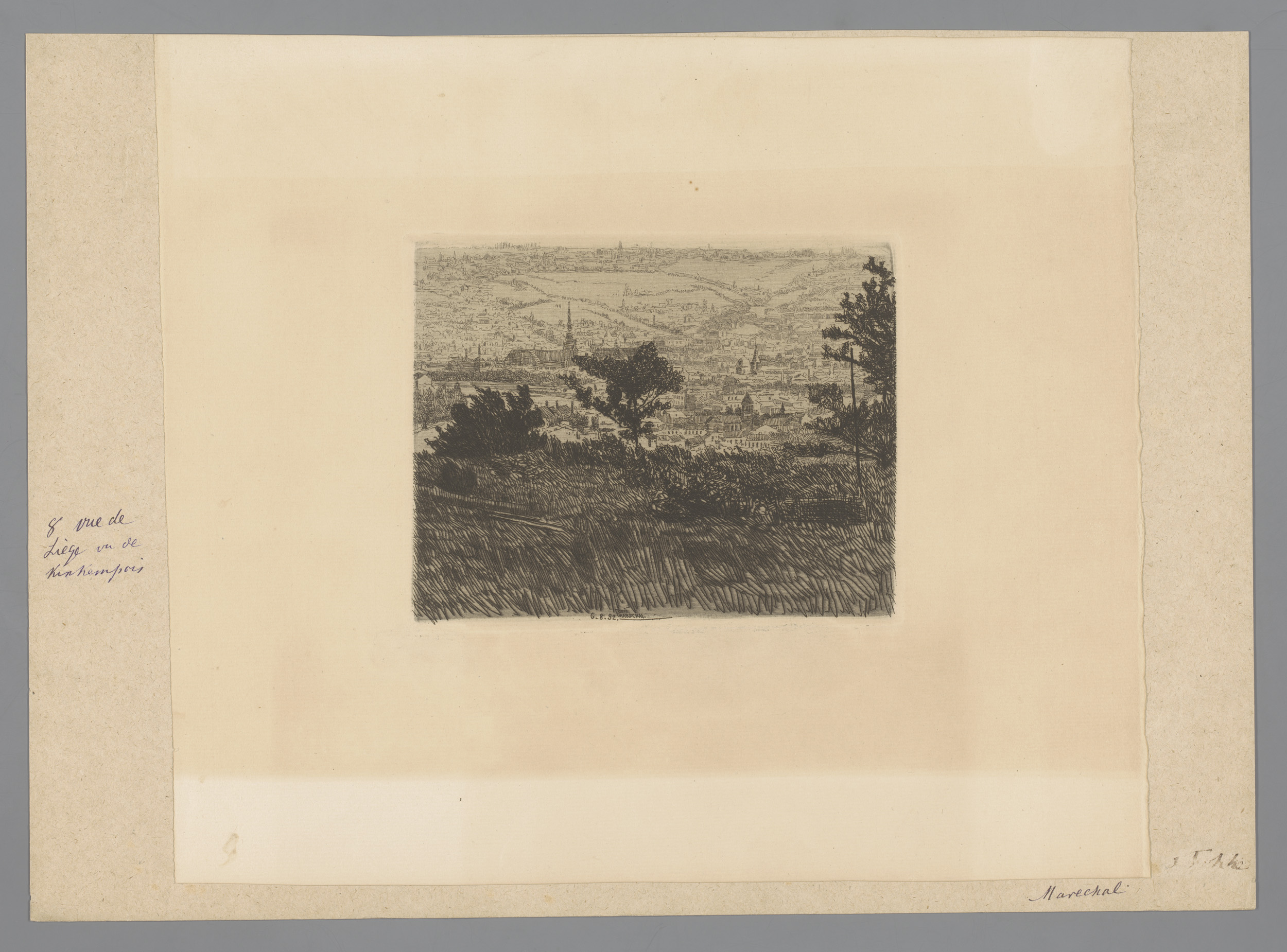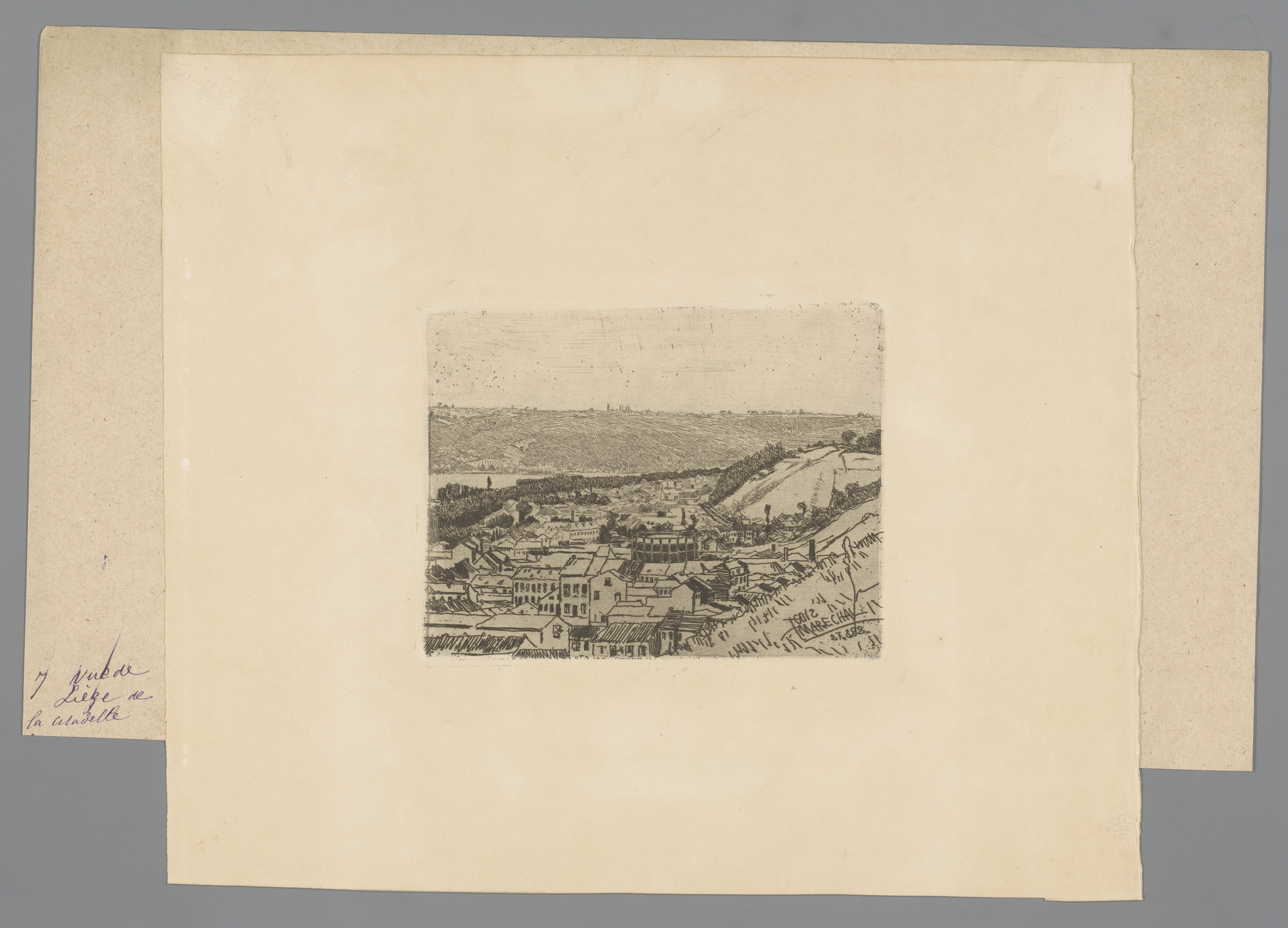 Gezicht op Luik met werktuig op de voorgrond