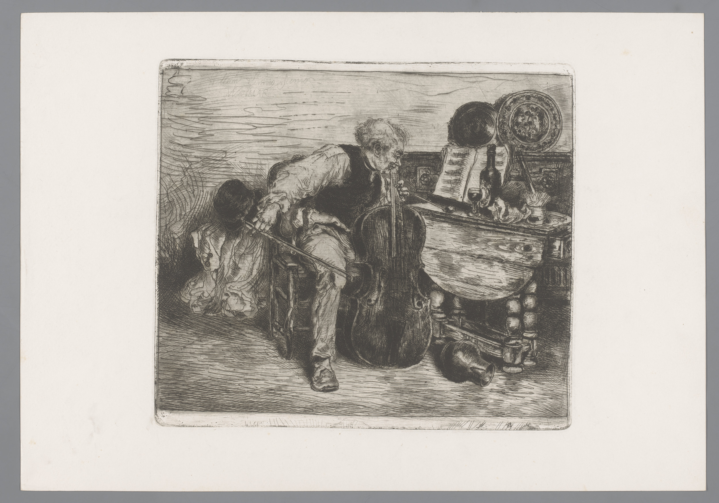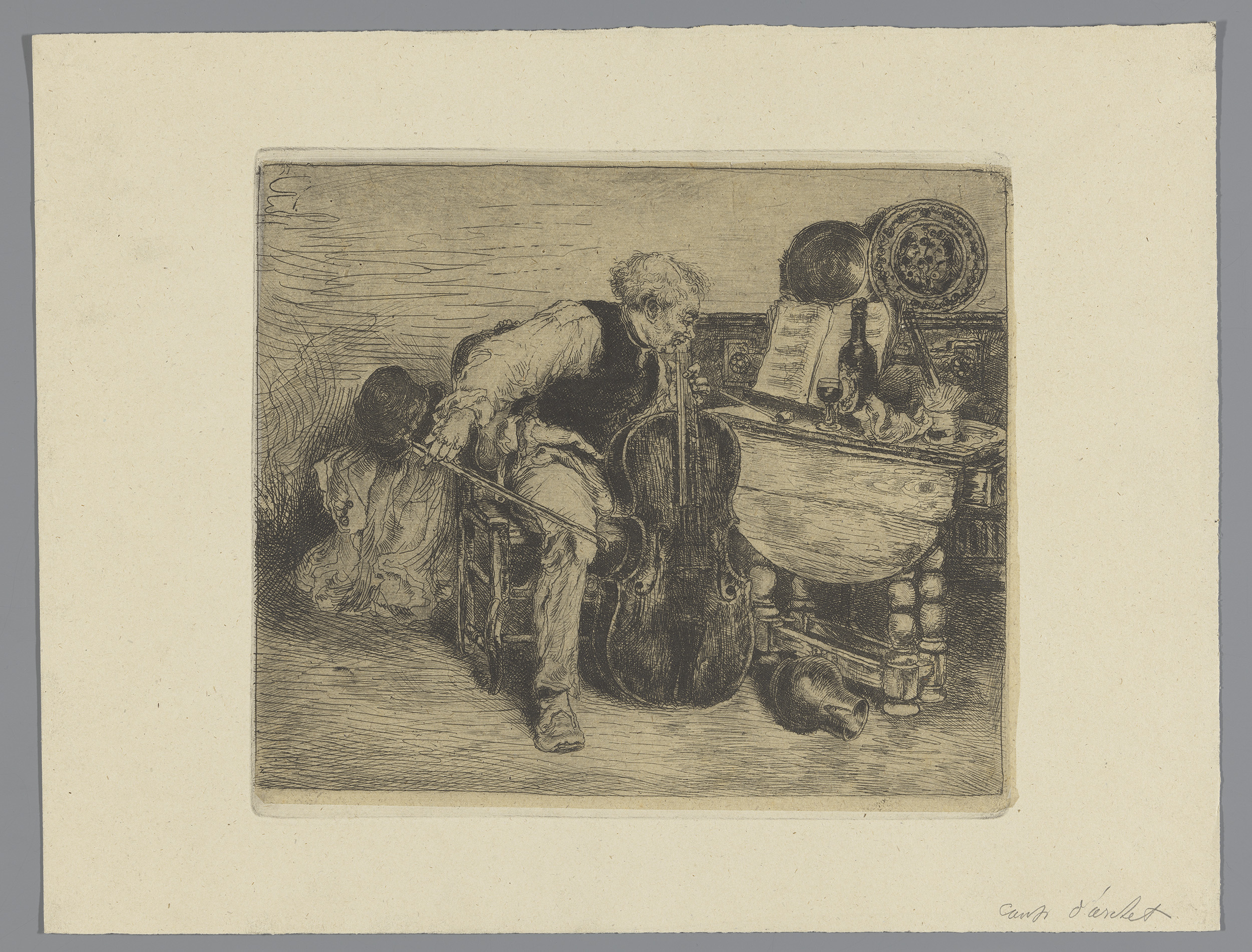 Muzikant besnaart een cello voor hem op tafel